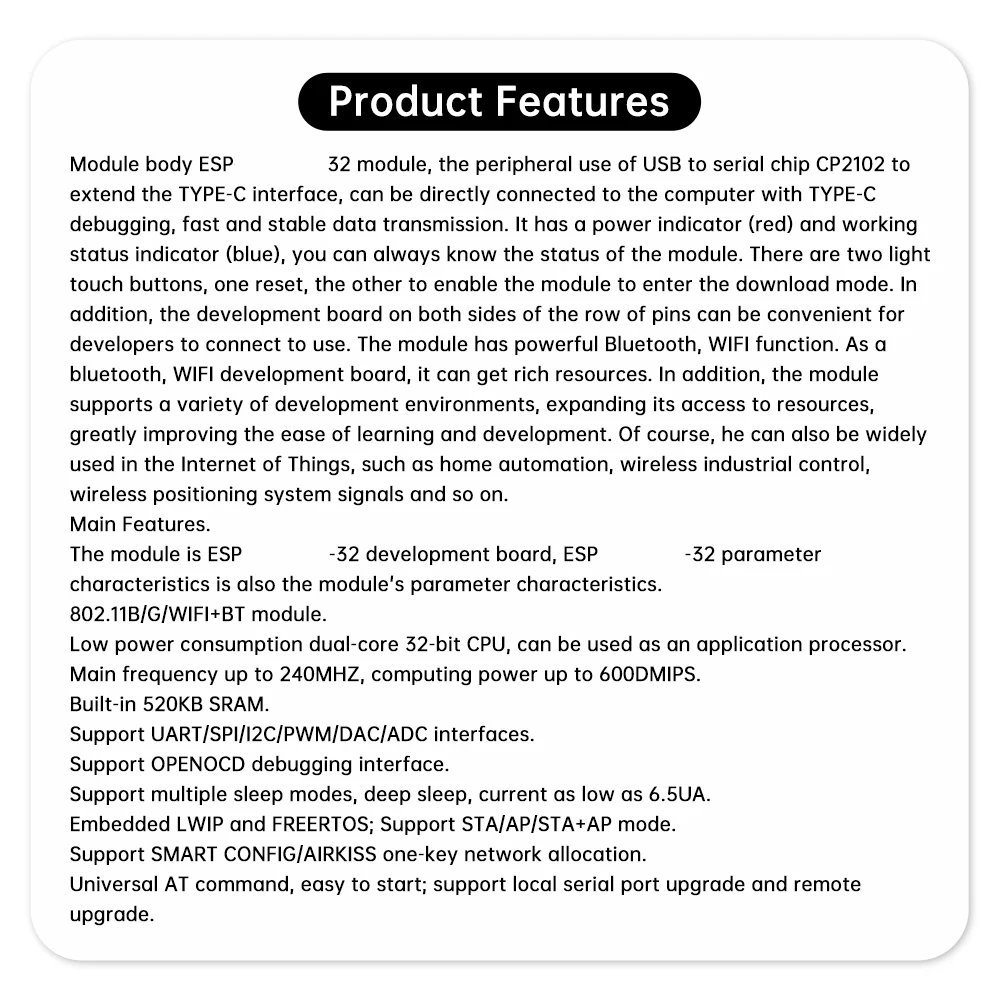 1.El módulo es una placa de desarrollo ESP-WROOM-32 y las características de los parámetros de ESP-WROOM-32 se refieren a las características de los parámetros del módulo.