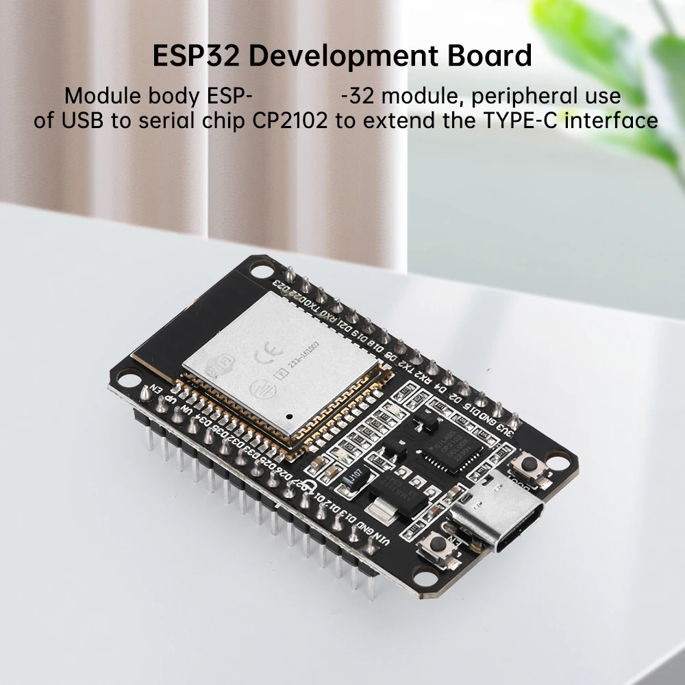 El cuerpo principal del módulo es el módulo ESP-WROOM-32, que utiliza un chip de puerto USB a serie CP2102 para ampliar la interfaz TYPE-C.Se puede conectar directamente a una computadora para su depuración y la transmisión de datos es rápida y estable.Tiene una luz indicadora de encendido (luz roja) y una luz indicadora de estado de funcionamiento (luz azul), que le permite conocer el estado del módulo en cualquier momento.Hay dos botones táctiles, uno para restablecer y el otro para permitir que el módulo entre en modo de programa de descarga.Además, los pines a ambos lados de la placa de desarrollo pueden facilitar la conexión y el uso de los desarrolladores.