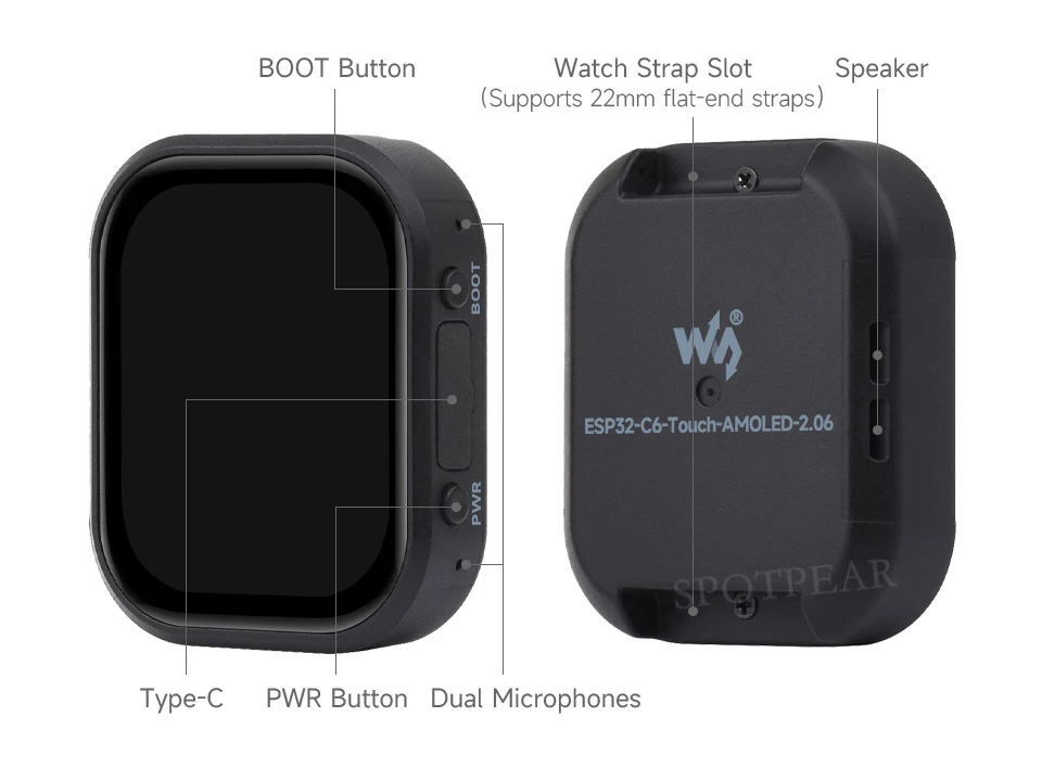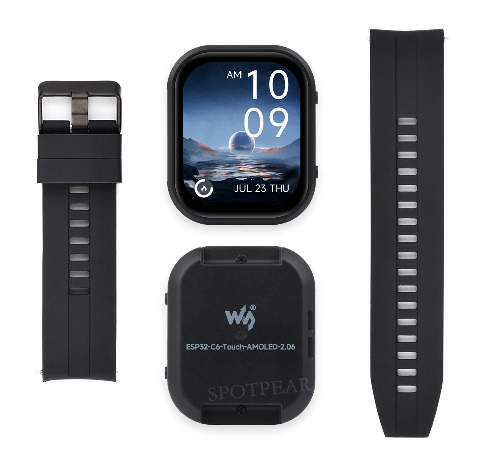 ElESP32-C6-Touch-AMOLED-2.06Es una placa de desarrollo estilo reloj portátil y de alto rendimiento diseñada por Waveshare.Basado en el microcontrolador ESP32-C6, integra una pantalla táctil capacitiva AMOLED de 2,06 pulgadas, IMU de 6 ejes, chip RTC, chip de códec de audio, IC de administración de energía, etc.Viene con una funda diseñada a medida con apariencia similar a una de un reloj inteligente, lo que la hace ideal para la creación de prototipos y la verificación funcional de aplicaciones portátiles.