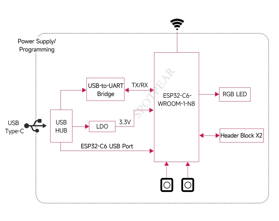 [] Adopta el módulo ESP32-C6-WROOM-1-N8, que está equipado con un procesador de un solo núcleo RISC-V de 32 bits, frecuencia principal de hasta 160 MHz, flash incorporado de 8 MB;Integra periféricos ricos que incluyen SPI, UART, I2C, I2S, LED PWM, SDIO y otras interfaces;Los chips HUB USB CH343 y CH334 integrados admiten el desarrollo de USB y UART al mismo tiempo a través de un puerto USB-C.Compatible con la distribución de pines de la placa de desarrollo ESP32-C6-DevKitC-1-N8, más conveniente de usar y ampliar una variedad de módulos periféricos.