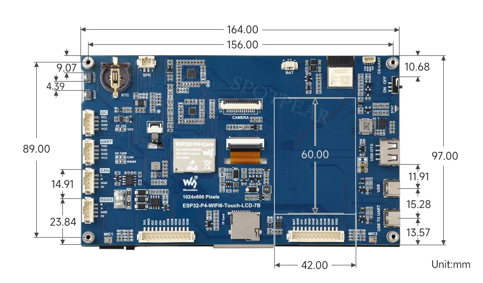 La placa genera interfaces periféricas comunes como MIPI-CSI, MIPI-DSI, USB 2.0 OTG HS, ranura para tarjeta SDIO 3.0, micrófonos duales con soporte de cancelación de eco, terminales de altavoz y soporte de batería RTC.