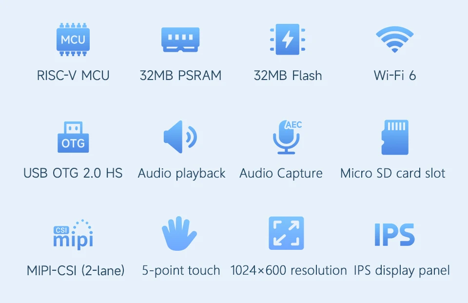 Este producto es una placa de desarrollo RISC-V de alto rendimiento basada en el chip ESP32-P4, que cuenta con un procesador de doble núcleo y un solo núcleo.Cuenta con una pantalla táctil horizontal de 7 pulgadas, 1024 × 600 y admite un rico conjunto de interfaces de interfaz hombre-máquina, incluido MIPI-CSI (procesador de señal de imagen integrado).También admite USB On-The-Go 2.0 de alta velocidad (HS) para conectividad de alta velocidad, lo que permite una gama más amplia de aplicaciones.El chip ESP32-P4 integra un periférico de firma digital y una unidad de gestión de claves dedicada para garantizar la seguridad operativa y de datos.Diseñado para aplicaciones de alto rendimiento y alta seguridad, satisface plenamente las demandas de aplicaciones integradas de soporte avanzado de interfaz hombre-máquina, capacidades de computación de bordes y conectividad de E/S.