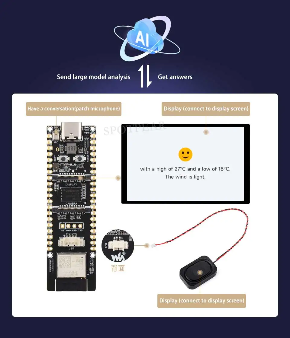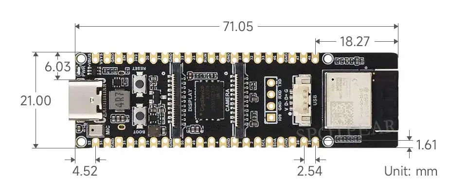 Interfaces periféricas comunes como MIPI-CSI, MIPI-DSI, USB 2.0 OTG, ranura para tarjeta SDIO 3.0 SD, terminales de micrófono y altavoz salen de la placa.