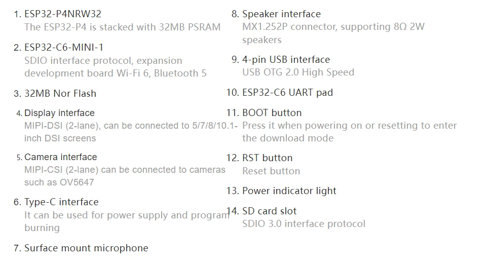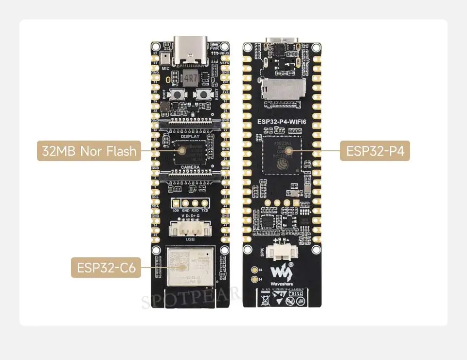 La placa de desarrollo adopta el módulo ESP32-P4 y tiene ESP32-C6 y 32 MB Nor Flash integrados.