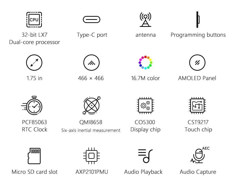 Este producto es una placa de desarrollo de microcontroladores altamente integrada y de alto rendimiento diseñada por Waveshare.En un formato pequeño, está equipado con un 1.Pantalla AMOLED capacitiva de alta definición de 75 pulgadas, un chip de administración de energía altamente integrado, un sensor de seis ejes (acelerómetro de tres ejes y giroscopio de tres ejes), RTC, un chip de códec de audio de baja potencia, un circuito de cancelación de eco y otros. periféricos, facilitando el desarrollo e integración en productos.。