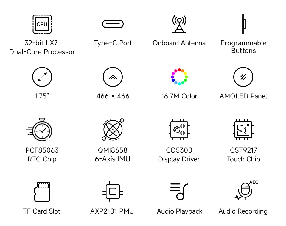 IMU integrada de 6 ejes QMI8658 (acelerómetro de 3 ejes y giroscopio de 3 ejes) para detectar gestos de movimiento, conteo de pasos, etc.