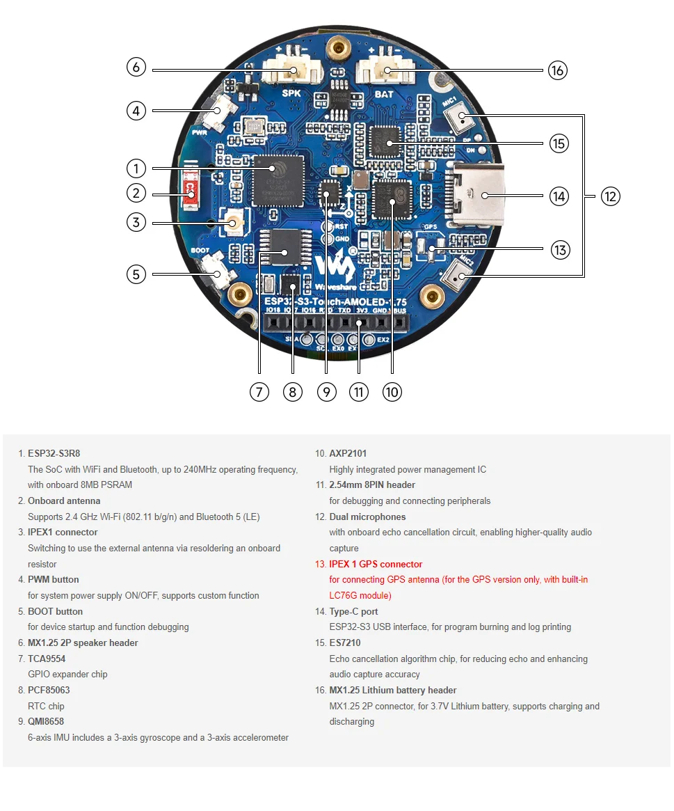 El ESP32-S3-Touch-AMOLED-1.75 es una placa MCU altamente integrada y de alto rendimiento diseñada por Waveshare.Es de tamaño compacto, integrado 1.Pantalla táctil capacitiva AMOLED de 75 pulgadas, IC de administración de energía, sensor de 6 ejes (acelerómetro de 3 ejes y giroscopio de 3 ejes), chip RTC, códec de audio de baja potencia, circuito de cancelación de eco, etc., lo que le facilita el desarrollo y integrarse en los productos rápidamente.