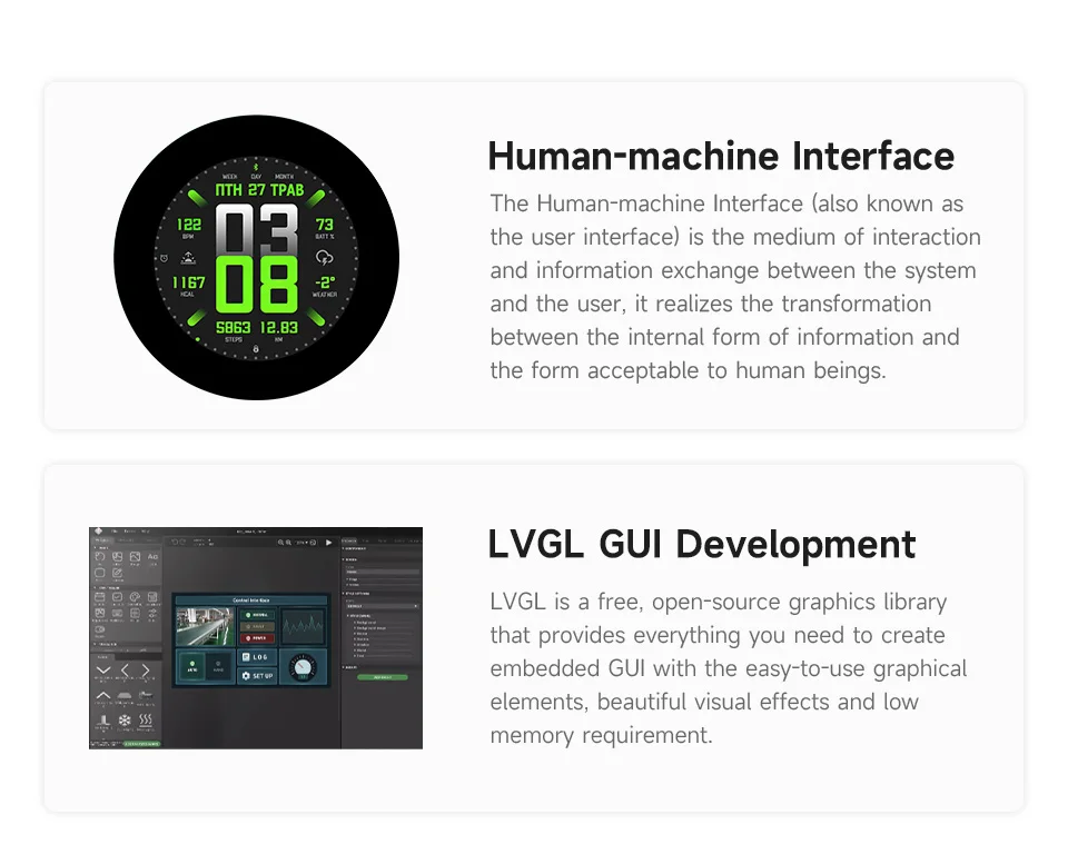 ESP32-S3-Touch-LCD-2.1 es una placa de desarrollo de microcontrolador con soporte WiFi de 2,4 GHz y Bluetooth BLE 5, integra Flash y PSRAM de alta capacidad.La pantalla táctil capacitiva integrada de 2,1 pulgadas puede ejecutar sin problemas programas GUI como LVGL.Combinado con varias interfaces periféricas, adecuado para el rápido desarrollo de HMI y otras aplicaciones ESP32-S3.