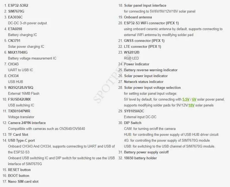 TheESP32-S3-SIM7670G-4Gis a multi-functional and high-performance microcontroller development board designed by Waveshare, build-in SIM7670G 4G communication module, onboard OV series camera interface, TF card slot, RGB colorful LED, 18650 battery holder (18650 battery is NOT included), battery voltage measurement IC, solar panel charging interface, and other peripherals. Adopts the ESP32-S3R2 chip, which integrates low-power WiFi and BLE 5.0, onboard external 16MB Flash and 2MB PSRAM, built-in hardware encryption accelerator, random number generator, HMAC, and digital signature module to meet the security requirements of the IoT. Equipped with SIM7670G Cat-1 4G communication module to achieve mobile network connection and meet the low-power requirements of IoT, mobile devices, outdoor monitoring, smart home, and other applications.