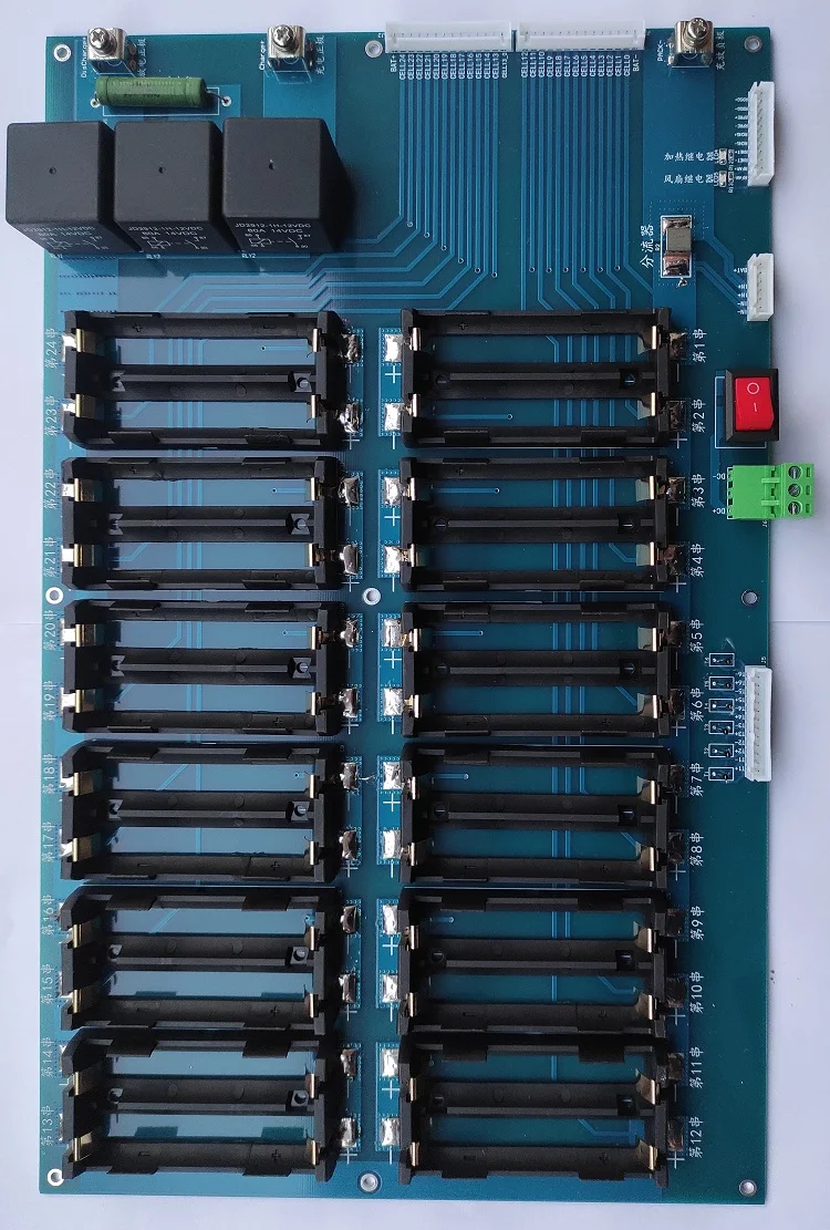 电池盒板包含24串18650电池盒+三路继电器+预充电阻+6六路NTC热敏电阻+分流器