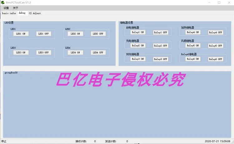 连接好以后如上如单体电压,总电压,总电流都会显示在PC软件上。如下图BMS的继电器和LED都可以通过上位机指令控制开关。