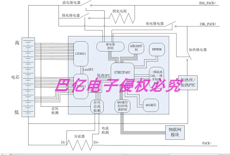 此参考设计是以凌厉尔特LTC6811单体电压采集芯片的锂电池管理系统,高达16位的单体电压采集精度,最高1.2mV测量误差。单片最多可同时监测12串电芯。本设计采用两片LTC6811芯片通过isoS接口菊链式连接,可同时管理多达24串电芯。系统采用STM32F407具有高速运算处理能力的Cortex-M4内核的主控芯片。电池总电压,总电流使用24位高精度AD采集芯片。两路CAN通信,其中一路隔离CAN可用于VCU之间通信,另外一路非隔离CAN可以用于充电机通信,并通过此路CAN把BMS内部数据(单体电压,总电压,总电流,温度,警报等)发送到PC上位机。 并带有两路RS485通信,其中一路用于物联网模块之间的通信,可把BMS内部数据发到网络,即可实时远程监控电池包工作状态。系统具备5路(放电,充电,预充,加热,风扇)继电器控制回路。
