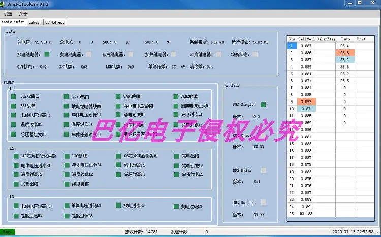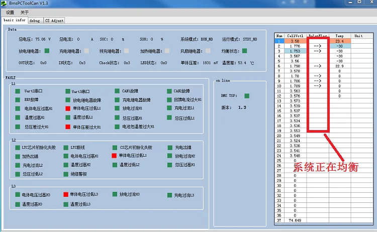 如上图电池模拟板J3端子(模拟低位12串电池), J4端子(模拟高位12串电池), 连接到BMS板的J6端子上,定义顺序如5.5所示。把BMS的J5中(13 14)的BATtop+连接到电池模拟板J4的C24。电池板模拟板的DC+ DC-连接DCDC的输入端,DCDC的输出端正极负极经过开关分别连接到BMS的J1中(1,2,3,4)DC12V+,DM12V+和(5,6)GND上。连接好后电池模拟板的DC+ DC-供电72V~100V电压即可。 BMS板J1的(33,34)CAN2_H, CAN2_L连接到CAN卡上, CAN卡的USB连接到PC电脑上,安装好CAN卡的驱动后,打开BmsPCTool软件点击连接便可看到BMS数据显示在PC软件上。连接好后如下顺序上电。