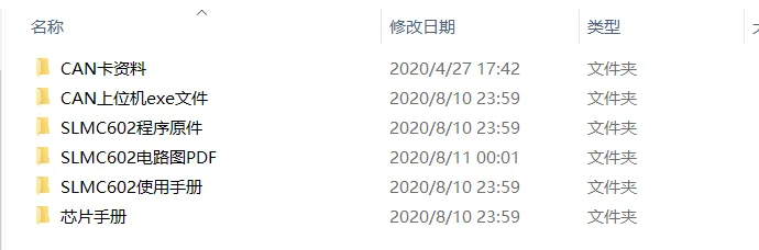 配送资料:电路图(PDF)+程序源代码+上位机执行程序+通信协议+SLMC602板子手 册+各个芯片手册+其他