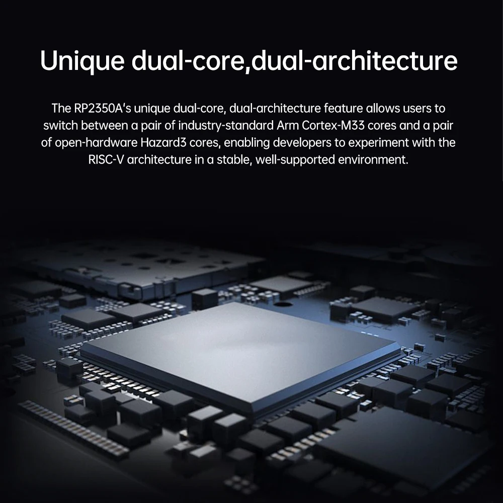 La característica única de doble núcleo y arquitectura dual de RP2350A permite a los usuarios cambiar entre un par de núcleos Arm Cortex-M33 estándar de la industria y un par de núcleos Hazard3 de hardware abierto, lo que permite a los desarrolladores probar la arquitectura RISC-V en un entorno estable y bien respaldado..