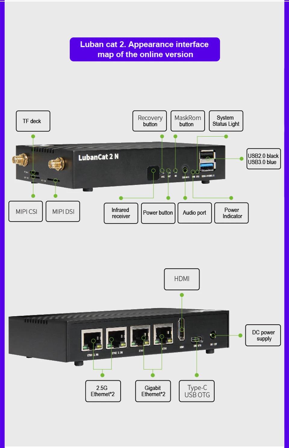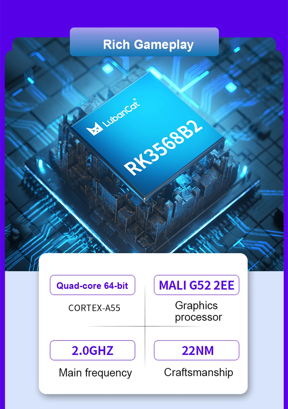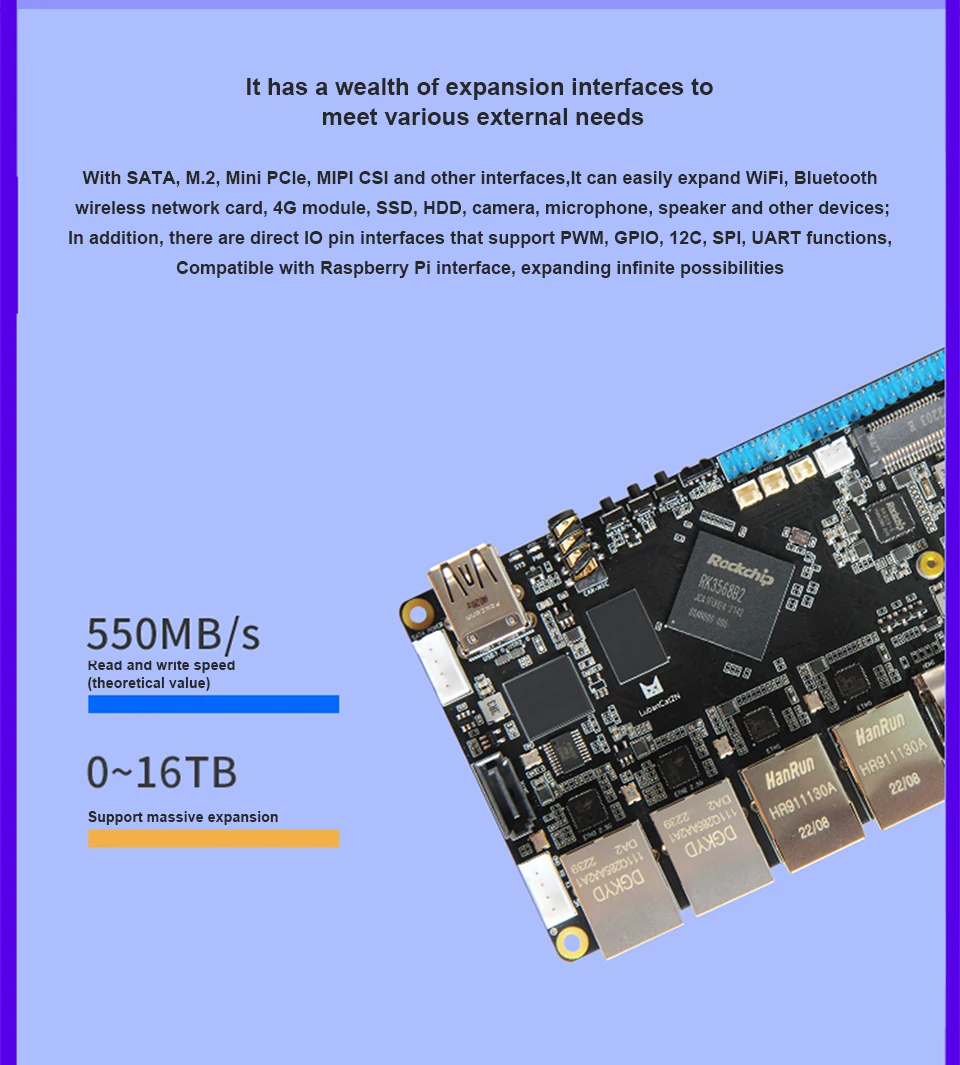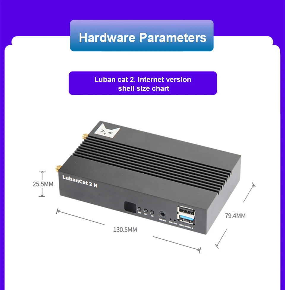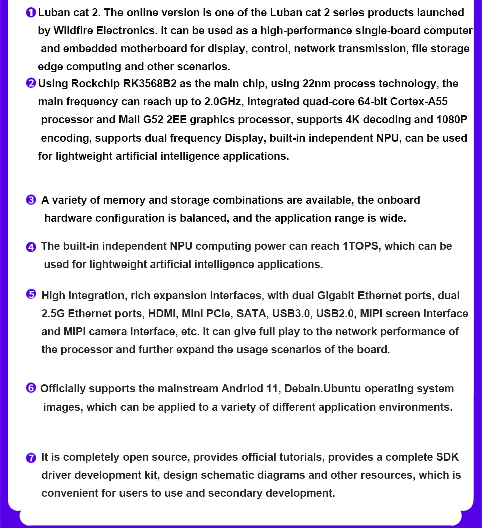 LubanCat-2N utiliza un SOC que incluye un procesador Cortex-A55 de cuatro núcleos, un procesador gráfico Mali G52 2EE y una NPU de alta eficiencia energética.-E y otras interfaces comunes se pueden utilizar como enrutadores suaves, servidores de almacenamiento de archivos y pequeños servidores WEB.