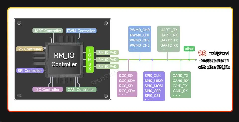 Rockchip Matrix IO comparte 98 funciones de multiplexación, lo que permite una configuración libre de la distribución de pines funcionales.