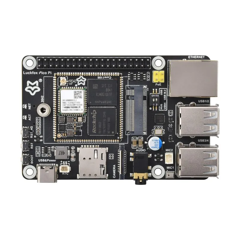 Módulo Wi-Fi integrado, ranura M.2 del módulo 4G, encabezado del módulo PoE, tipo C, USB-A HOST, MIPI CSI, GPIO, puerto de red, conector de audio de 3,5 mm, micrófono SMD, conector de micrófono, conector de batería RTC, etc..