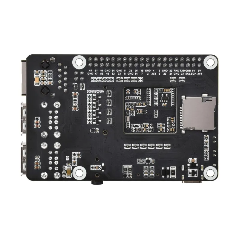 eMMC integrado, adaptando varias interfaces a través de orificios almenados, como USB, PHY, salida de audio LINEOUT, entradas de audio MIC de 2 canales, MIPI CSI de 2 canales y 2 canales, RGB, RTC, etc.