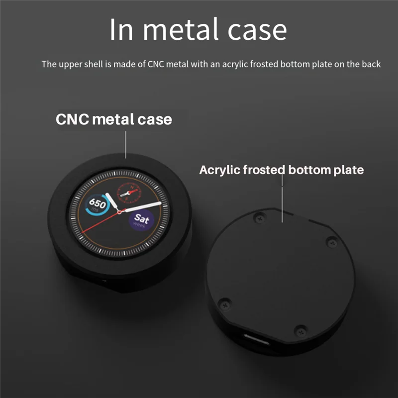 La carcasa superior está hecha de metal CNC y la parte posterior está equipada con una placa inferior acrílica esmerilada.
