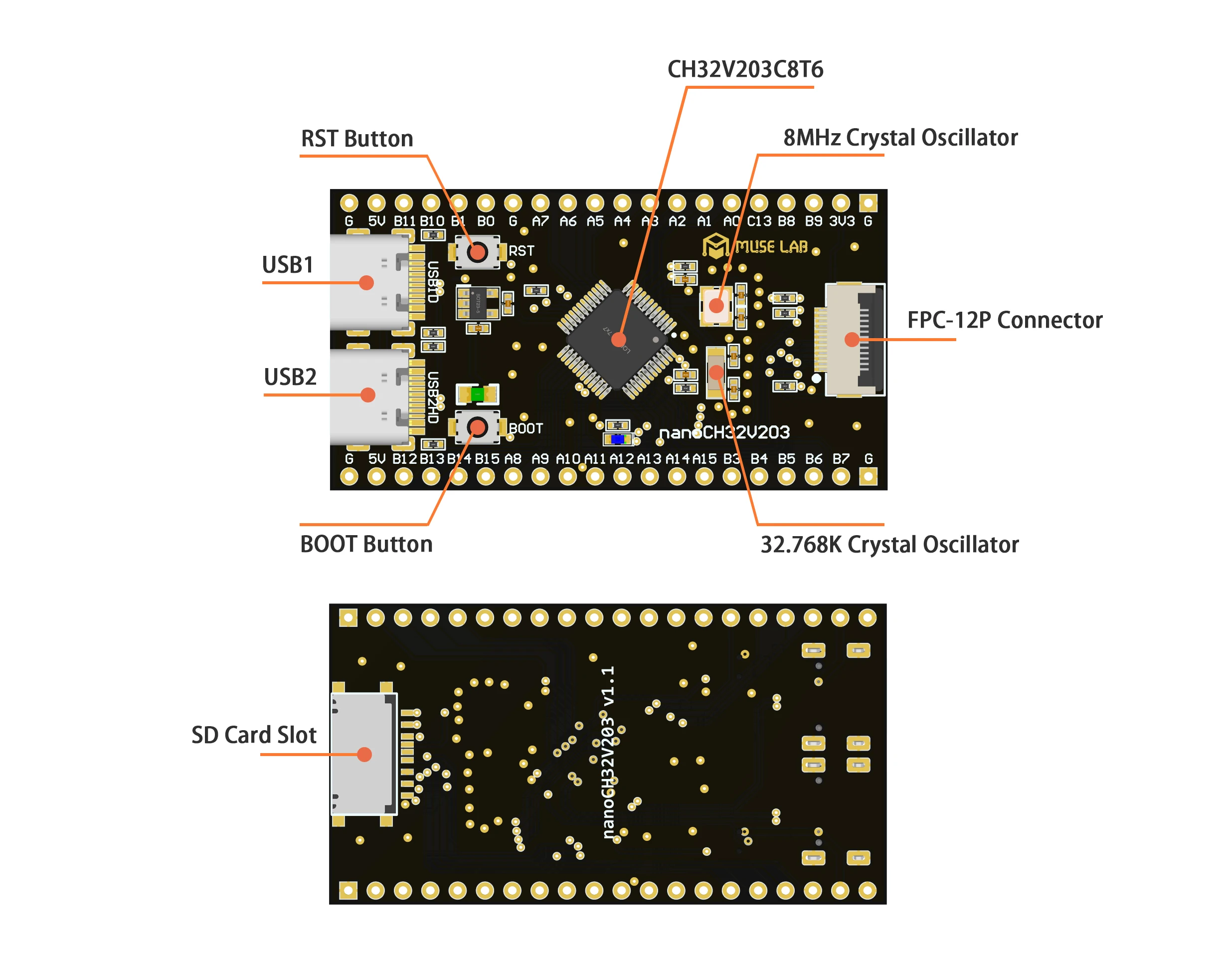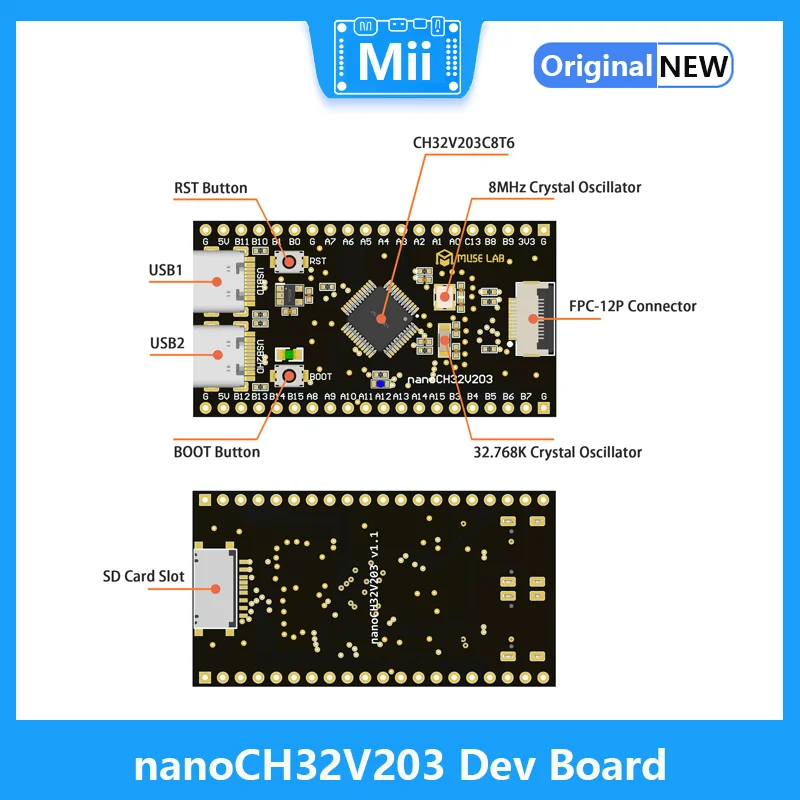 NanoCH32V203 es una placa de desarrollo hecha por MuseLab basada en CH32V203C8T6 de QinHeng. Cuenta con interfaces USB de doble, interfaz LCD y ranura para tarjeta SD a bordo, y se puede programar a través del puerto USB, lo que es conveniente para la verificación y el desarrollo de prototipos.