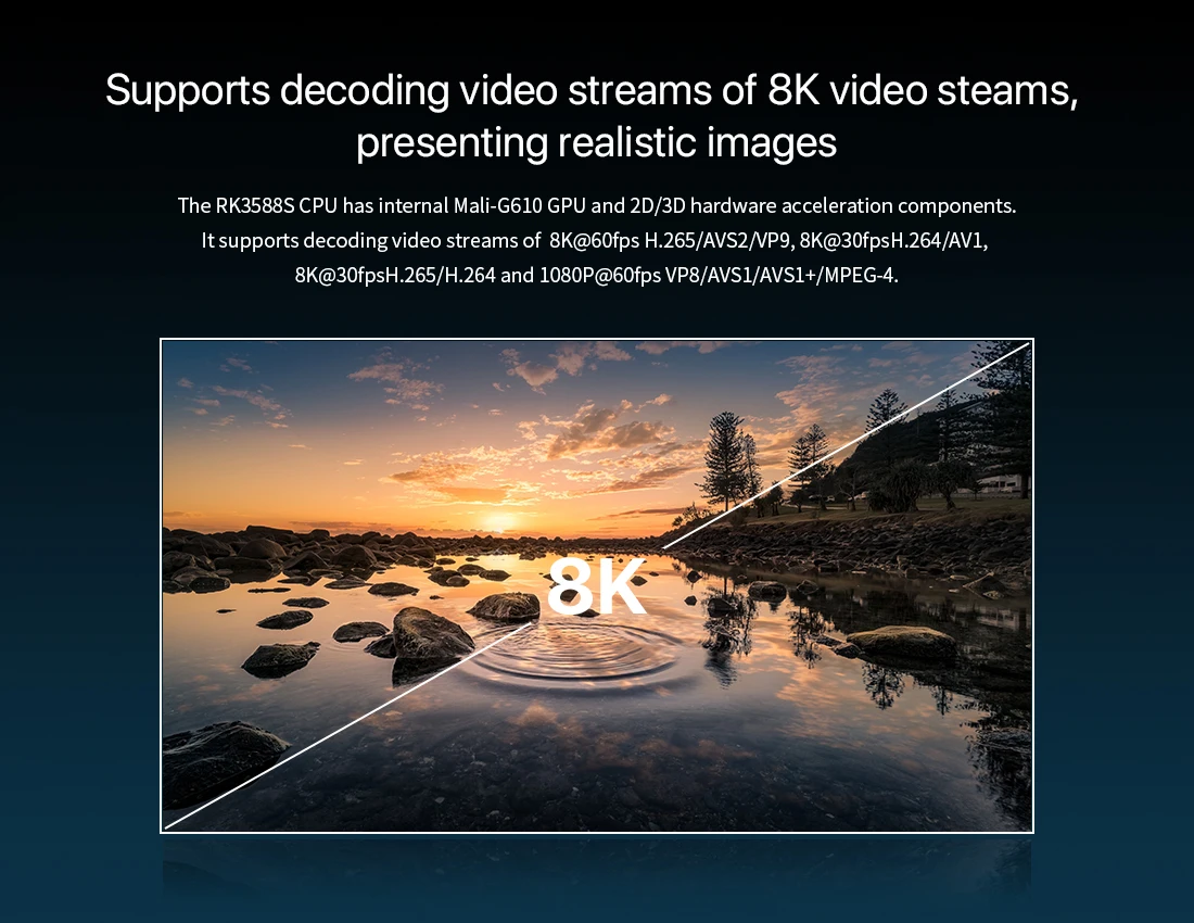 Decodificador 8K @ 60fps H.265 y VP9, decodificador 8K @ 30fps H.264, decodificador 4K @ 60fps AV1, codificador 8K @ 30fps H.264 y H.265