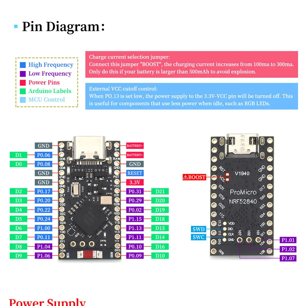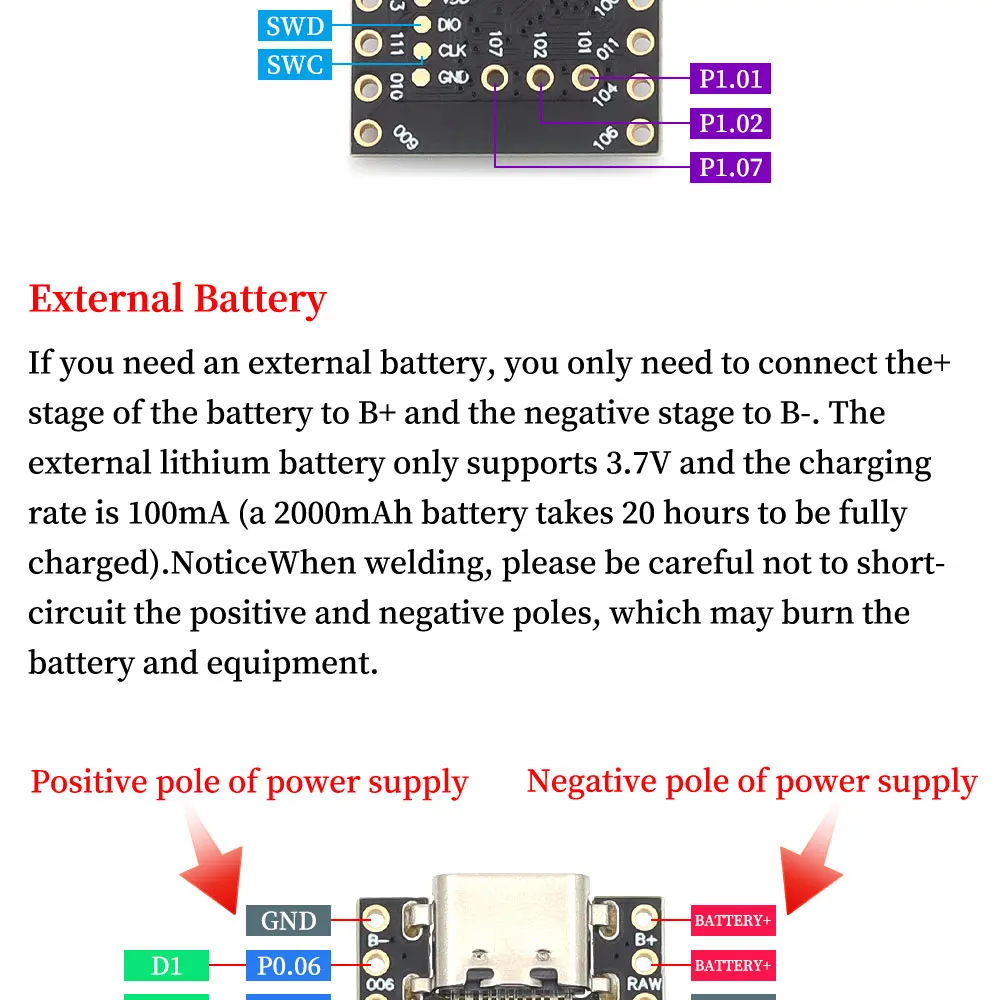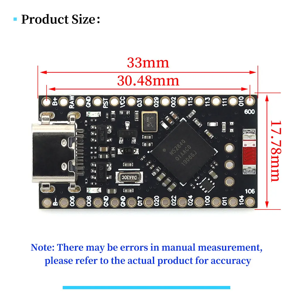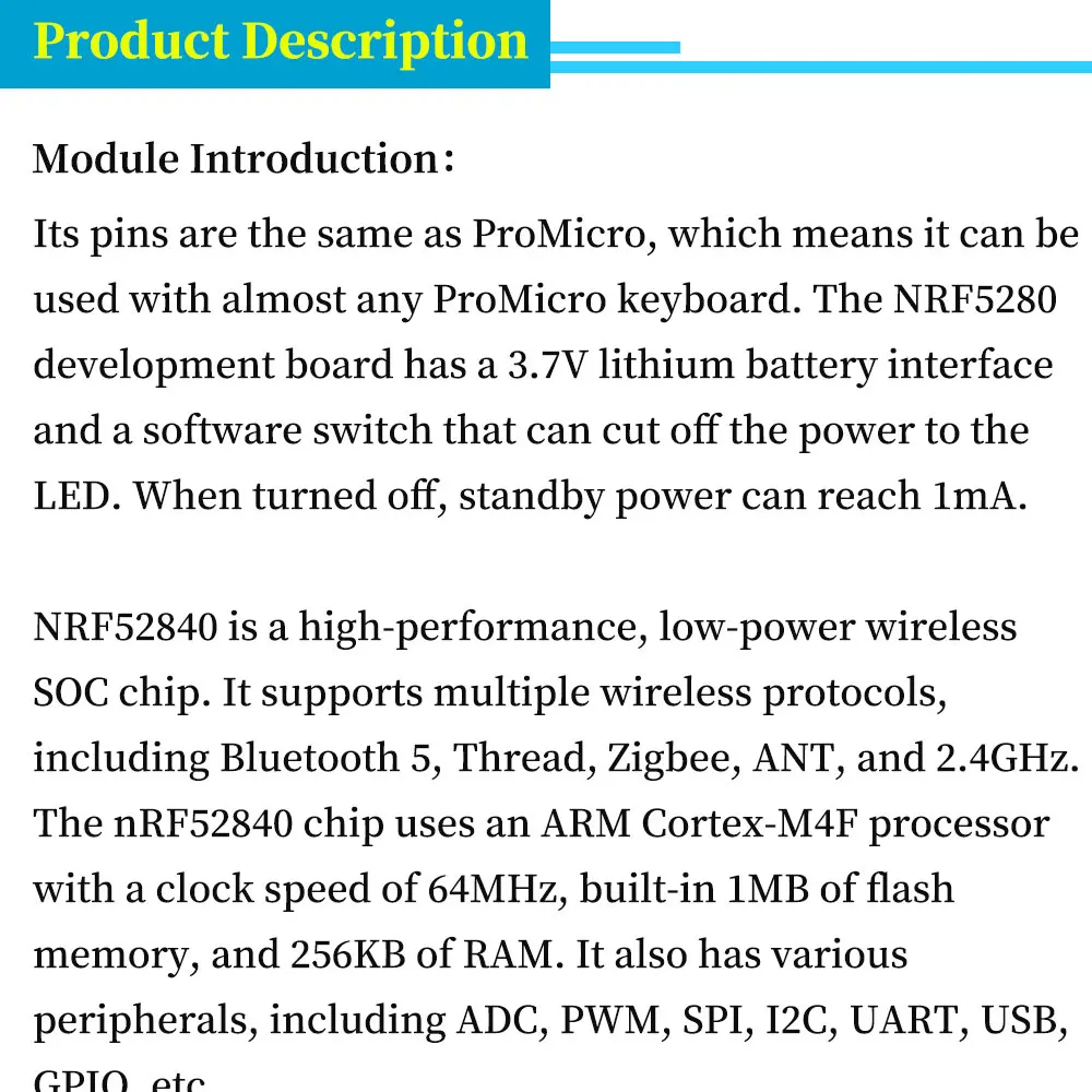 ¡SuperMini NRF52840 es una placa de desarrollo alternativa Pro Micro compatible con Nice!Nano.Sus pines son los mismos que ProMicro, lo que significa que se puede utilizar con casi cualquier teclado ProMicro.La placa de desarrollo NRF5280 tiene una interfaz de batería de litio de 3,7 V y un interruptor de software que puede cortar la alimentación del LED.Cuando está apagado, el consumo de energía en espera puede alcanzar 1 mA.
