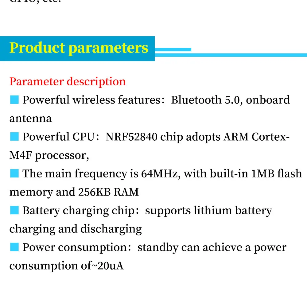 Admite múltiples protocolos inalámbricos, incluidos Bluetooth 5, Thread, Zigbee, ANT y 2,4 GHz. El chip nRF52840 utiliza un procesador ARM Cortex-M4F, clonado a 64 MHz, con 1 MB de memoria flash incorporada y 256 KB de RAM. También tiene una variedad de periféricos, incluidos ADC, PWM, SPI, I2C, UART, USB y GPIO, etc. Además, el nRF52840 también admite una variedad de funciones de seguridad, como cifrado AES, hash SHA-256 y True Random Number Generator (TRNG).