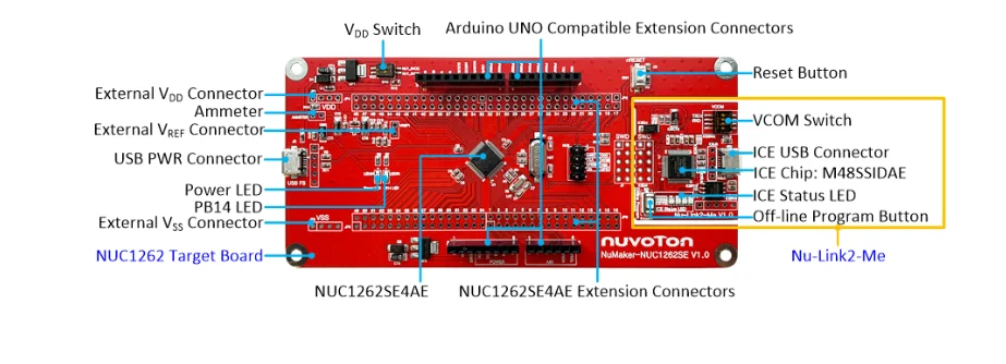 Otra parte del NuMaker-NUC1262SE es el programador de depuración Nu-Link 2-Me. El Nu-Link 2-Me puede programar y depurar el microcontrolador Nu-Tang en línea a través de la interfaz SWD y también puede realizar programación ICP sin conexión. El estado del programa se mostrará en el LED de estado. Nu-Link 2-Me también admite la función de puerto serie virtual (VCOM), que puede enviar mensajes a la ventana de la máquina de punto final. El Nu-Link 2-Me también se puede separar de la placa de desarrollo y convertirse en un programador de producción por lotes independiente.