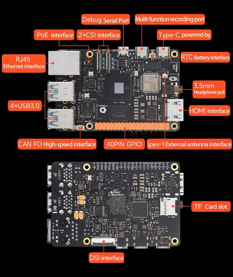 4 × USB 3.0 Host Type-A interface1 × USB 2.0 Device Type-C interface1 × USB 2.0 UART Micro-B interface1 × CAN FD interface40 PIN header, 28 GPIOs onboard, 3.3V logic, supports SPI, I2C, I2S, PWM, UART and other protocols
