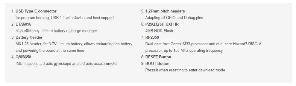 La exclusiva capacidad de doble núcleo y doble arquitectura de RP2350 permite a los usuarios elegir entre un par de núcleos Cortex-M33 de brazo estándar de la industria y un par de peligros de hardware abierto de 3 núcleos, lo que brinda a los desarrolladores la oportunidad de experimentar con la arquitectura RISC-V En un entorno estable y bien soportado