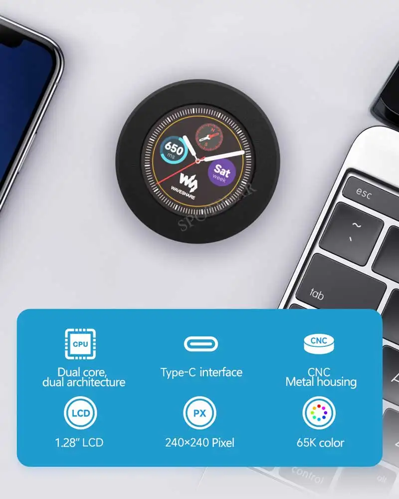Este producto es una placa de desarrollo de microcontroladores de bajo costo y alto rendimiento diseñada por Spotpear.En un formato pequeño, está equipado con un 1.Pantalla redonda LCD de 28 pulgadas, chip de carga de batería de litio y sensores de seis ejes (aceleración de tres ejes y giroscopio de tres ejes) y otros periféricos, y todas las interfaces GPIO y Debug se toman para facilitar el desarrollo y la integración de aplicaciones en los productos.