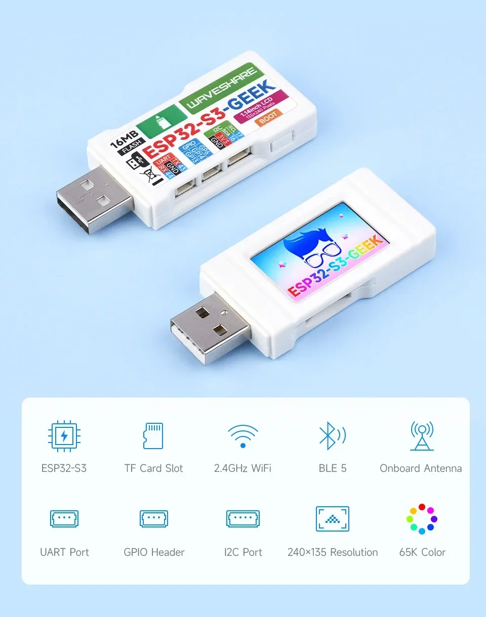 ESP32-S3-GEEKes una placa de desarrollo geek diseñada por Waveshare, puerto USB-A integrado, pantalla LCD de 1,14 pulgadas, ranura para tarjeta TF y otros periféricos.Admite WiFi de 2,4 GHz y BLE 5, con Flash integrado de 16 MB y PSRAM de 2 MB, proporciona puerto I2C, puerto UART e encabezado GPIO, brindando más posibilidades para su proyecto.