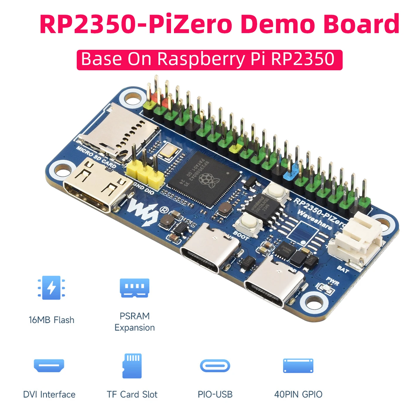 Comprar Placa de desarrollo Waveshare RP2350-PiZero Base en microcontrolador Raspberry Pi Pico 2 RP2350 520KB SRAM 16MB Flash DVI PIO-USB