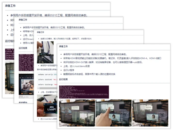 We have carefully produced a wealth of sample tutorials, covering audio and video input and output, audio and video codec, screenshots, streaming, recording, video mixing, special effects overlay, USB camera, GPIO operation, power management, touch screen operation, OLED screen control, etc. Links to help you remove all the problems that may be encountered in the product development process. We will continue to update sample projects and tutorials.