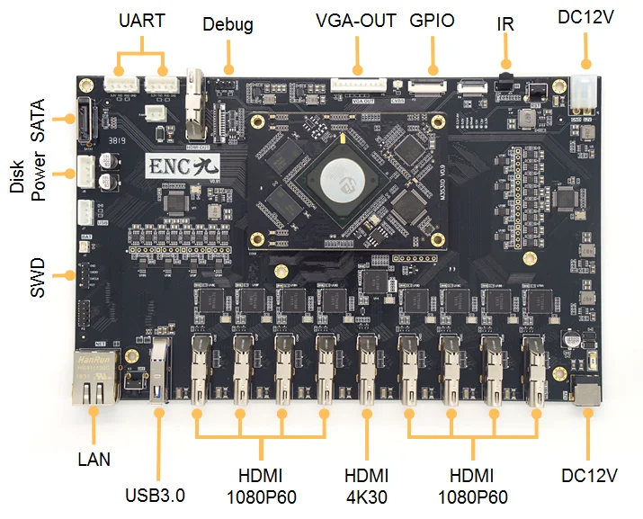 Product features Ultra-clear input, high performance, high configuration, customizable, expandable 4K-HDMIx11080P-HDMIx8 12x1080P or 3×4K simultaneous real-time encoding and decoding 2GB DDR3256MB Nand Flash open source system supports secondary development, expandable touch screen, audio board, battery pack, etc. interface layout performance Parameters core performance Main chip: Hi3531DV100 CPU: ARM Cortex A9 dual-core @1.4GHz Memory: 2GB DDR3 Fl