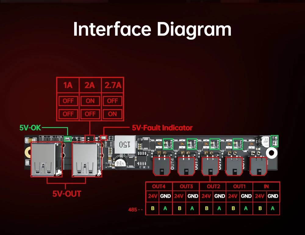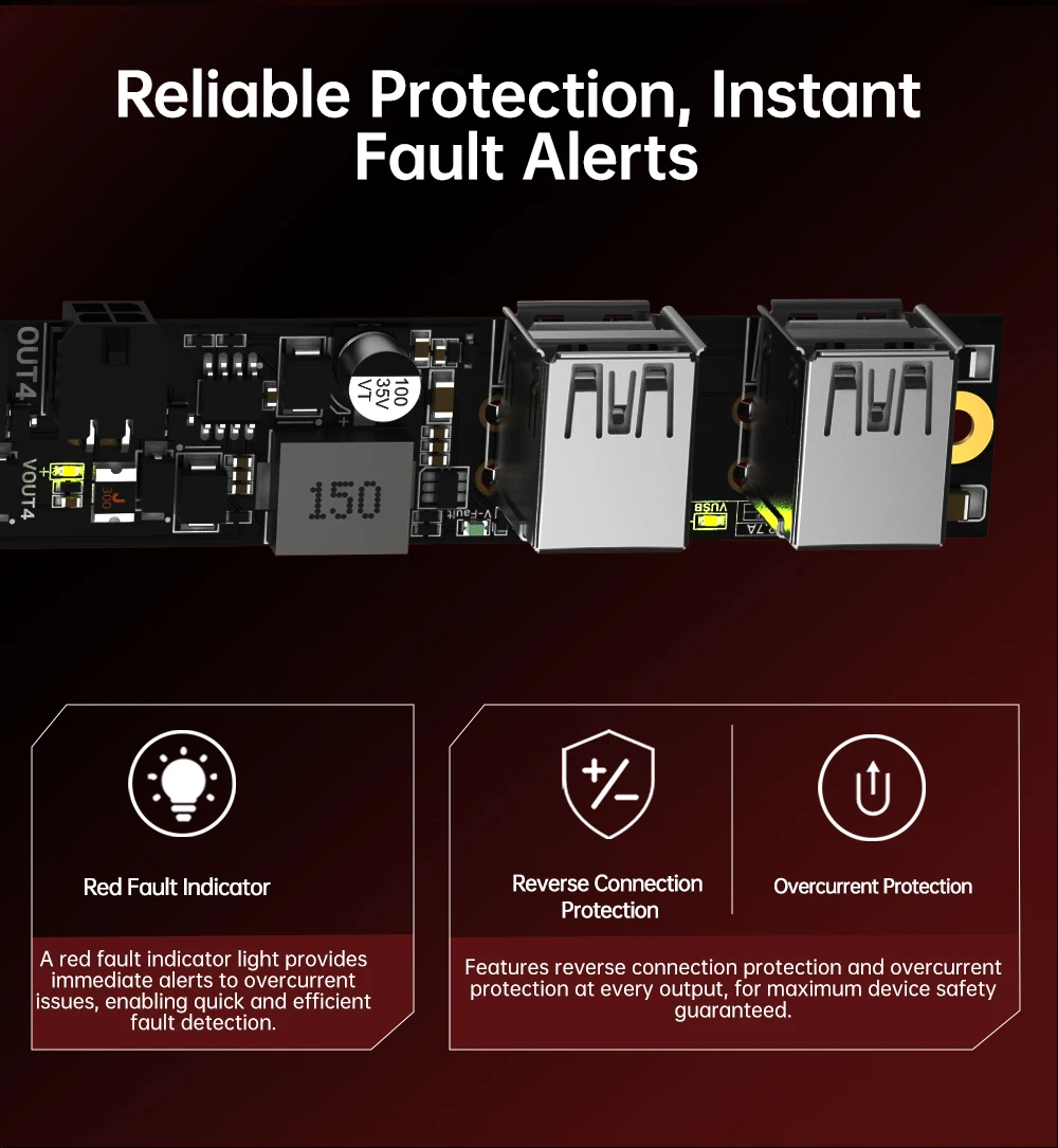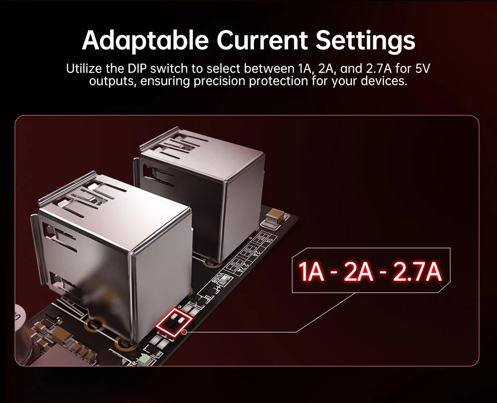 Utilice el interruptor DIP para seleccionar entre 1A, 2A y 2,7A para salidas de 5V, lo que garantiza una protección precisa para sus dispositivos.