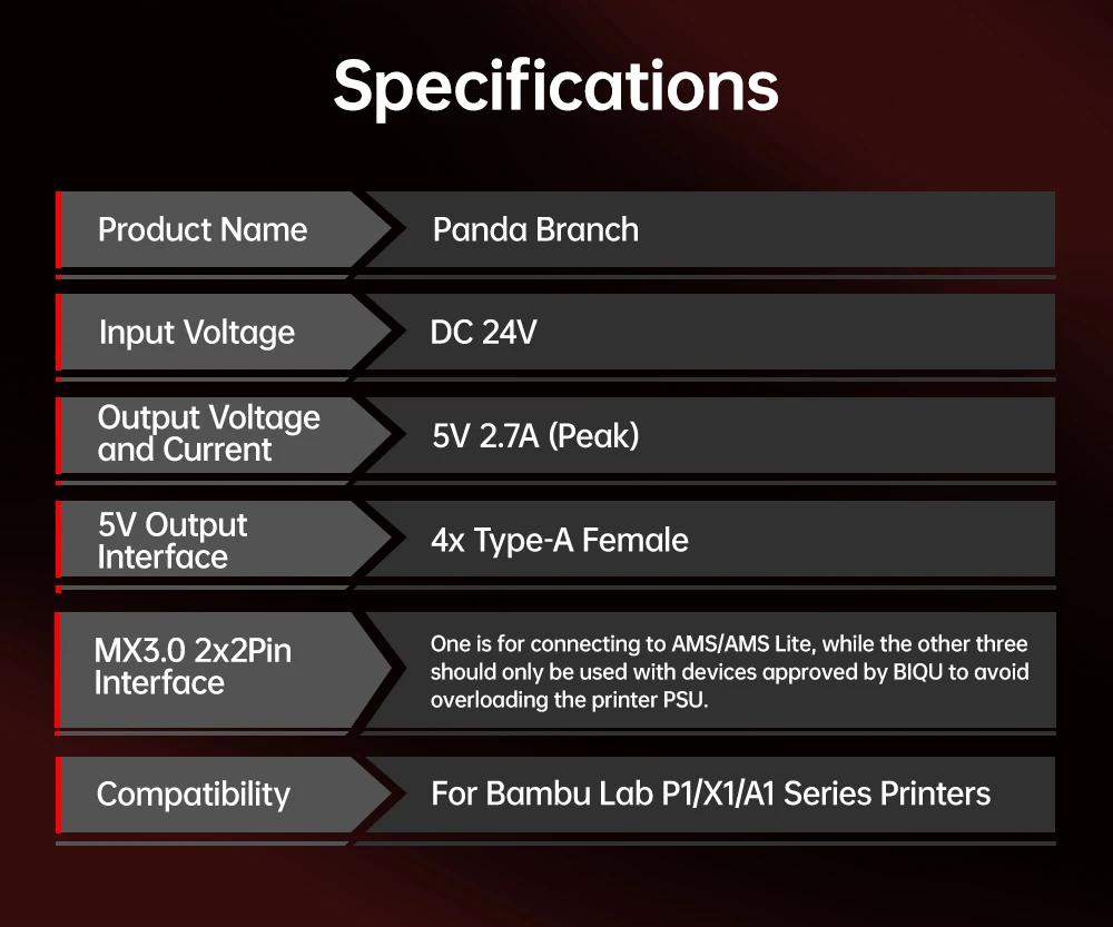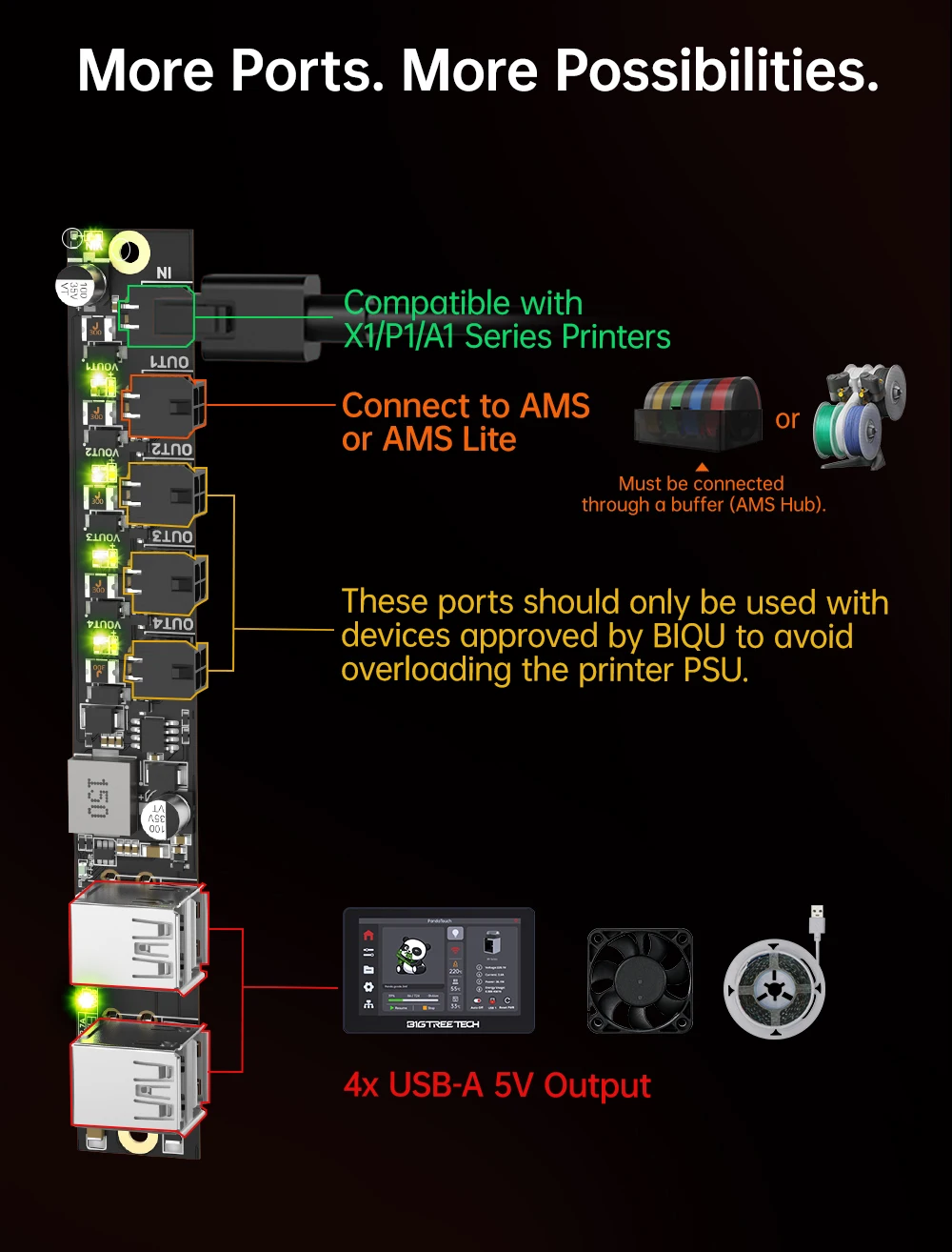 Interfaz MX3.0 de 2x2 pines: una es para conectarse a AMS/AMS Lite, mientras que las otras tres solo deben usarse con dispositivos aprobados por BIQU para evitar sobrecargar la fuente de alimentación de la impresora.