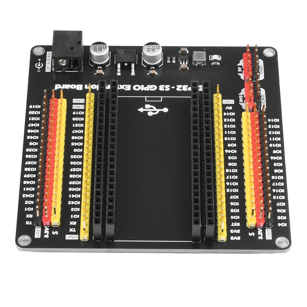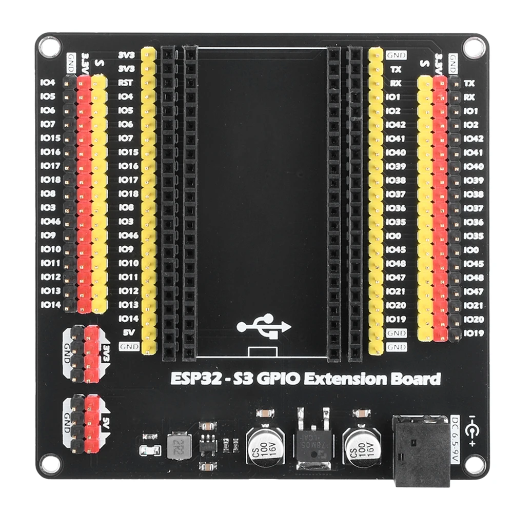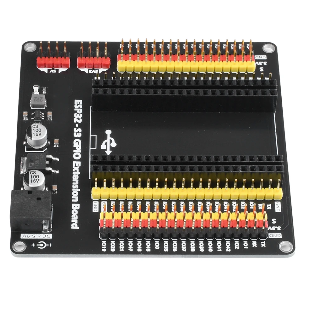 Bonito, pero sólo porque hay muy pocos modelos de placas de conexión ESP32 S3, se podría mejorar mucho. Tenga en cuenta que solo puede alimentar la placa y usar su regulador de voltaje con el conector cilíndrico y solo acepta 6-9V. No puedes alimentar la placa directamente con USB 5V. Y las regletas de pines VCC en ambos lados son solo de 3,3 V, no puedes elegir entre 3,3 o 5 como otras placas ESP32.