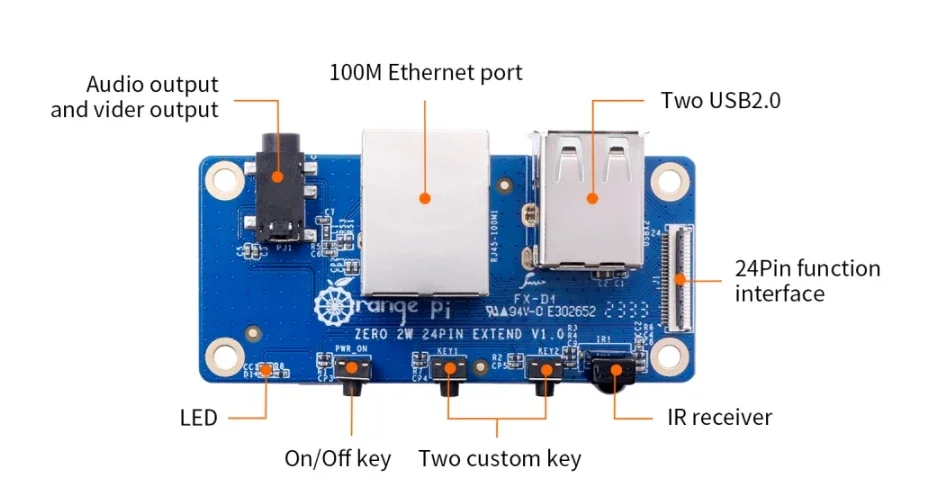 Esta placa de expansión es adecuada para Orange Pi Zero 2W, que se puede ampliar con USB2.0, 100M Ethernet, recepción IR, salida de audio, salida de TV, botón de encendido y otras funciones a través del conector de 24 pines.