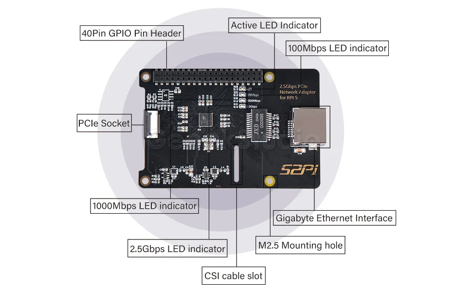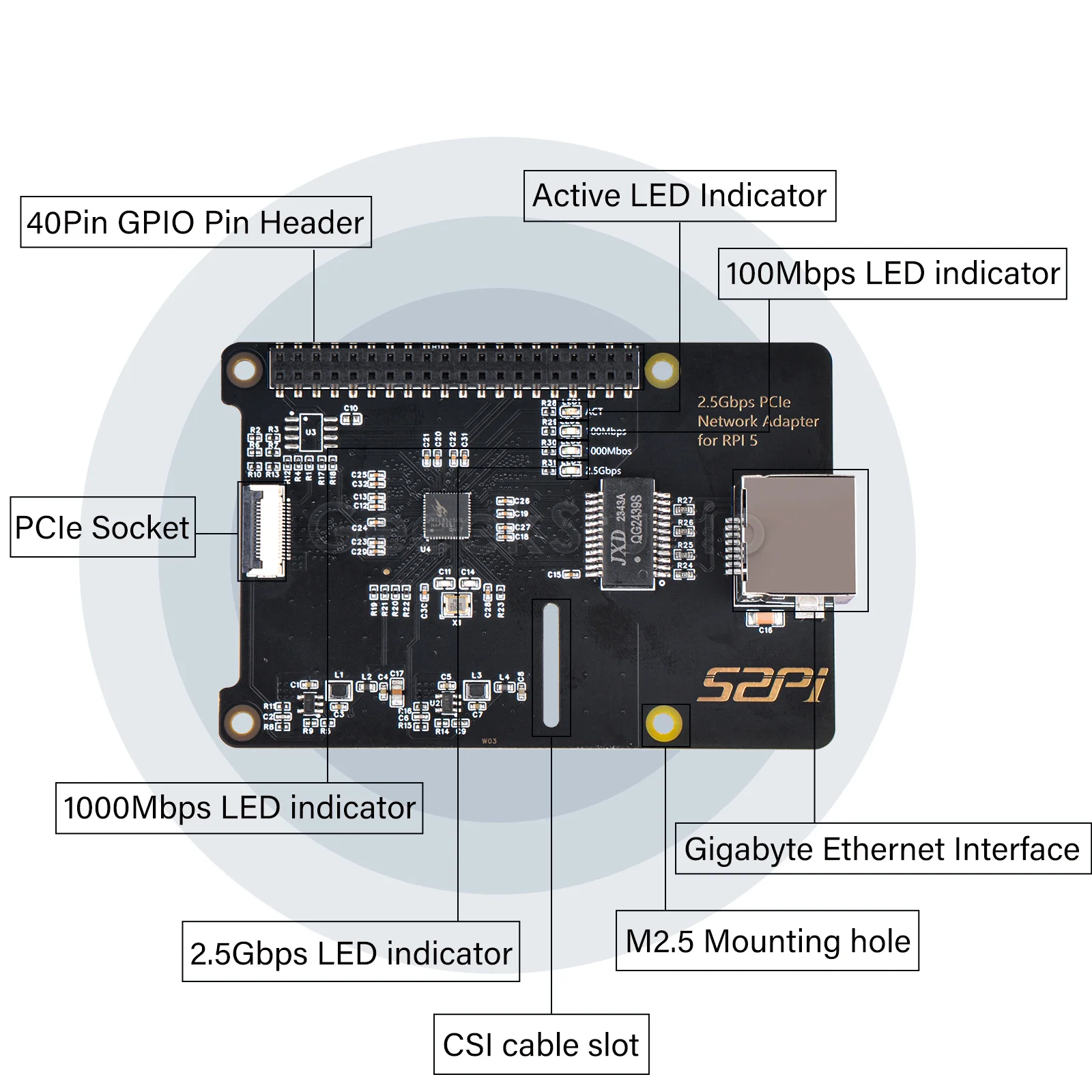 Interfaz PCIe de alta velocidad:El adaptador cuenta con una interfaz PCIe de 2,5 Gbps, lo que permite una rápida transferencia de datos y mejora el rendimiento general de la red de la Raspberry Pi 5.