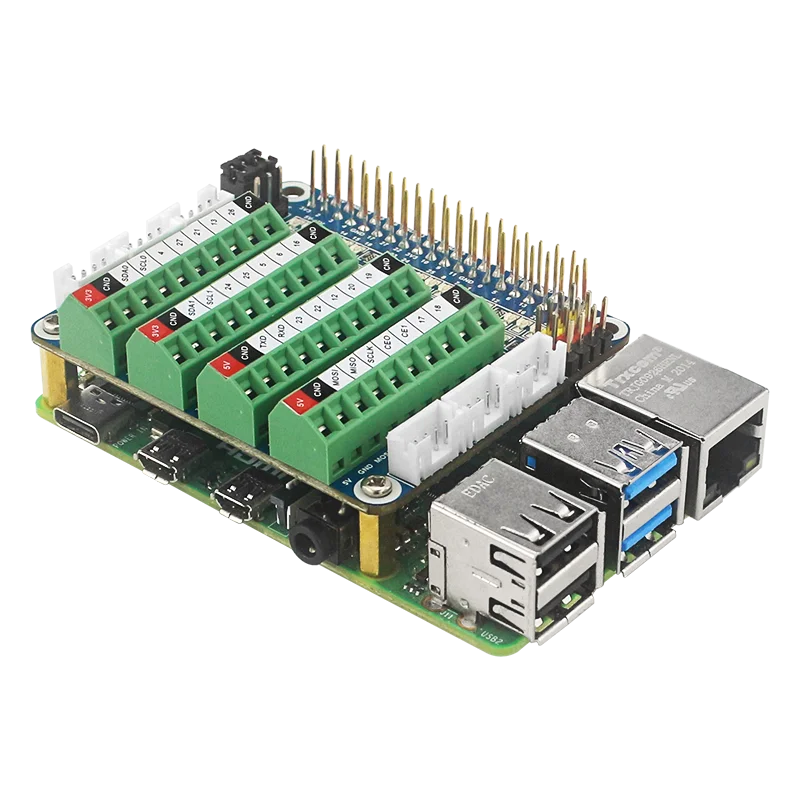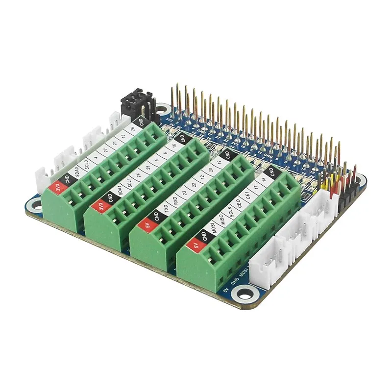 3. Paso del bloque de terminales de 3,5mm/0.138 ", rango de tamaño del cable de 26AWG a 16AWG, longitud de la tira de 5mm, tornillo M2 de acero, cabezal de PIN y jaula de cobre. Cabezal de pasador de expansión de 2x20 pines, altura 8mm/0,32 ".