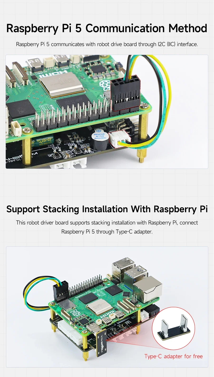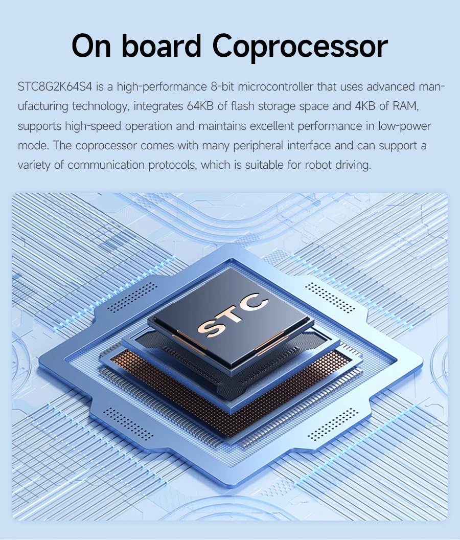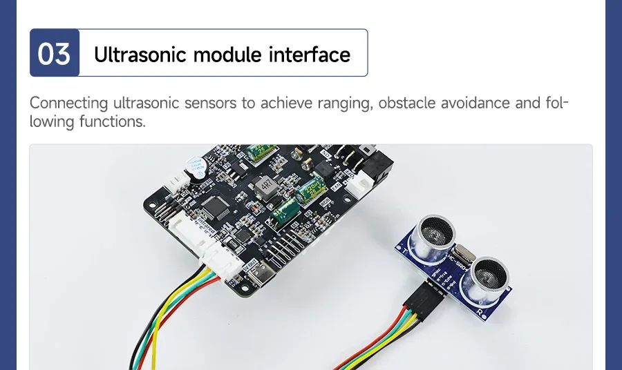 Comunicación IIC y retroalimentación de datos en tiempo real: se conecta con Raspberry Pi 5 a través de IIC, lo que permite la retroalimentación de datos del sensor en tiempo real, admitiendo un procesamiento eficiente de datos y control del robot.