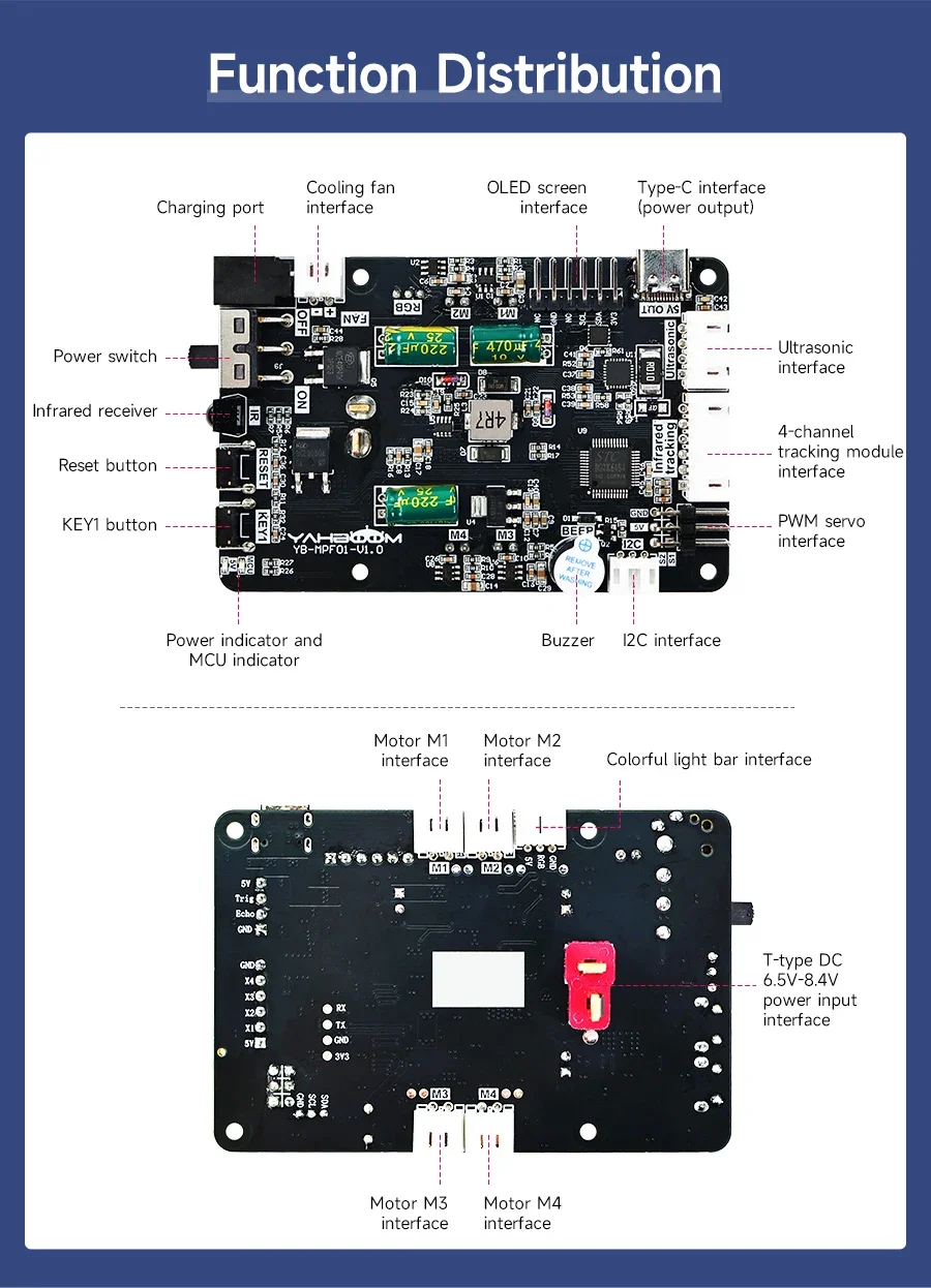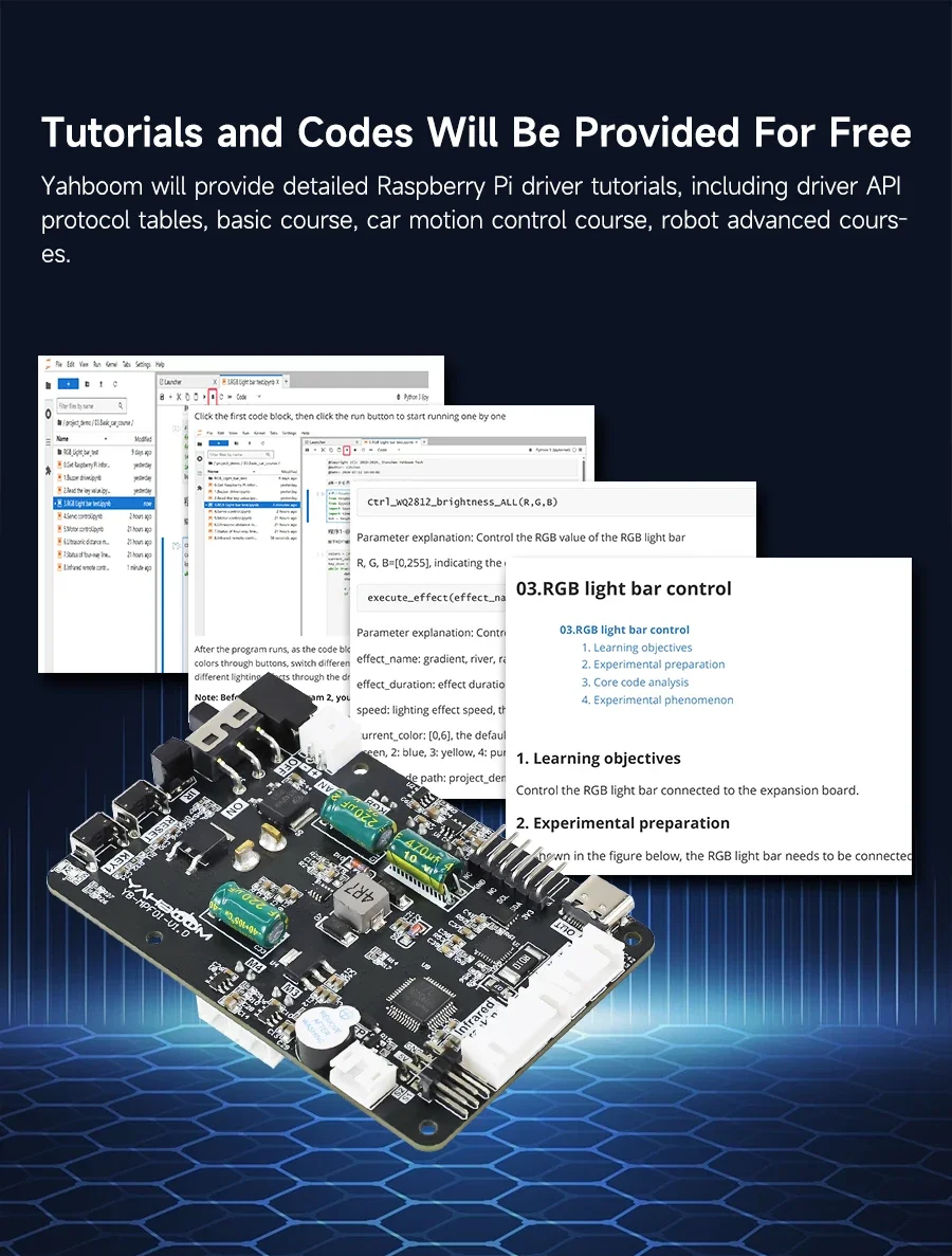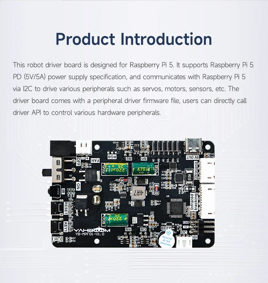 Esta placa de expansión de controladores es un módulo multifuncional diseñado para proyectos de robots Raspberry Pi, equipado con un protocolo de administración de energía PD para liberar completamente el potente rendimiento de Raspberry Pi 5.Viene con controladores de motor de 4 canales, servocontroladores PWM de 2 canales e interfaces reservadas para sensor de seguimiento, módulo ultrasónico y tira de luz RGB, lo que permite a los usuarios configurar la placa de manera flexible según las necesidades de su proyecto.La placa de expansión se comunica con Raspberry Pi 5 a través de IIC, lo que permite la retroalimentación de datos del sensor en tiempo real al sistema Raspberry Pi.A través de los lenguajes de programación de Python, los usuarios pueden manejar el procesamiento de datos y desarrollar algoritmos de control, logrando todo, desde la recopilación básica de datos del sensor hasta la planificación avanzada de comportamiento robótico.Yahboom proporciona documentación detallada de productos y códigos de ejemplo, lo que ayuda a los usuarios a comenzar rápidamente y hace que esta placa de expansión sea la opción ideal para el desarrollo de robots Raspberry Pi 5.