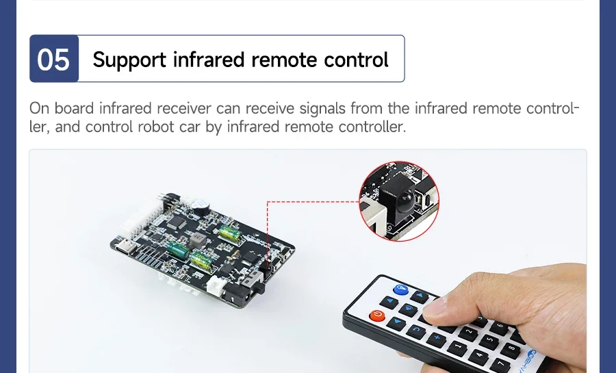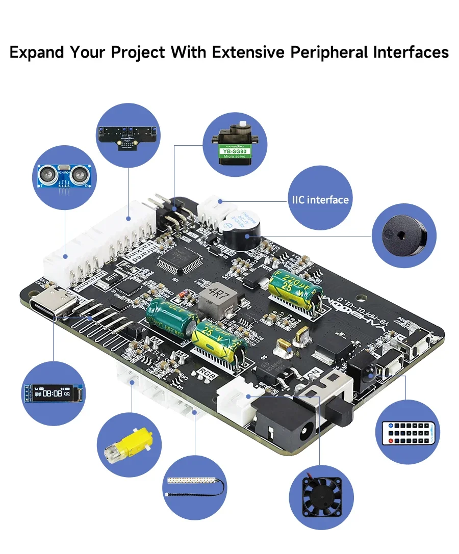 Mejor conducción y expansión: Equipado con controladores de motor de 4 canales, servocontroladores PWM de 2 canales, junto con interfaces para sensores de seguimiento, módulos ultrasónicos y tiras de luz RGB, adaptándose de manera flexible a diversas necesidades de proyectos robóticos.