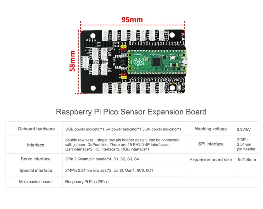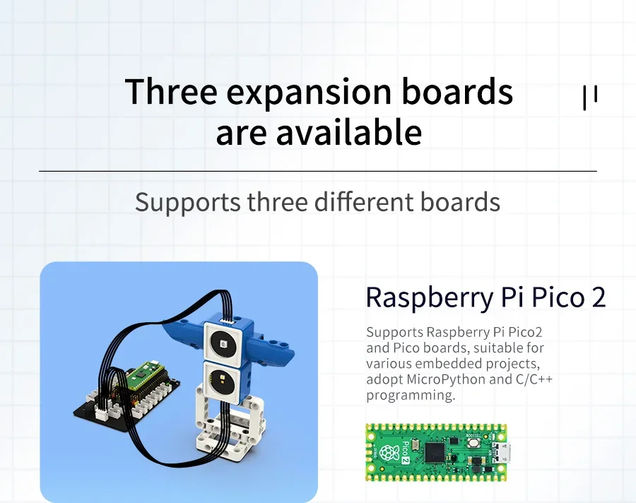 Estas placas de expansión amplían todos los pines de la placa Micro:bit/Raspberry Pi Pico 2/Pico/Arduino UNO.Cada dos pines adyacentes se combinan con GND y VCC para formar una interfaz PH2.0 de 4 pines, que se puede conectar a varios sensores a través del cable PH2.0.También diseñamos pines de servo en la placa de expansión, que se pueden usar para conectar todos los servos.Esta placa de expansión es perfectamente compatible con el mundo de la serie de módulos Yahboom y los módulos de sensores de la serie 3 en 1.