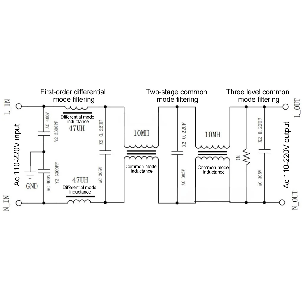 El compuesto de tres niveles (modo diferencial de 1 nivel + modo común de 2 niveles) Circuito de filtro de interferencia electromagnética EMI, debido al uso de tres niveles (también conocido como tres niveles) filtrado, tiene un mejor efecto de filtrado sobre el ruido. Puede suprimir eficazmente el problema de la interferencia de pulso de grupo transitorio rápido con una frecuencia de repetición de varios miles de hercios en ciertos sitios de usuario.