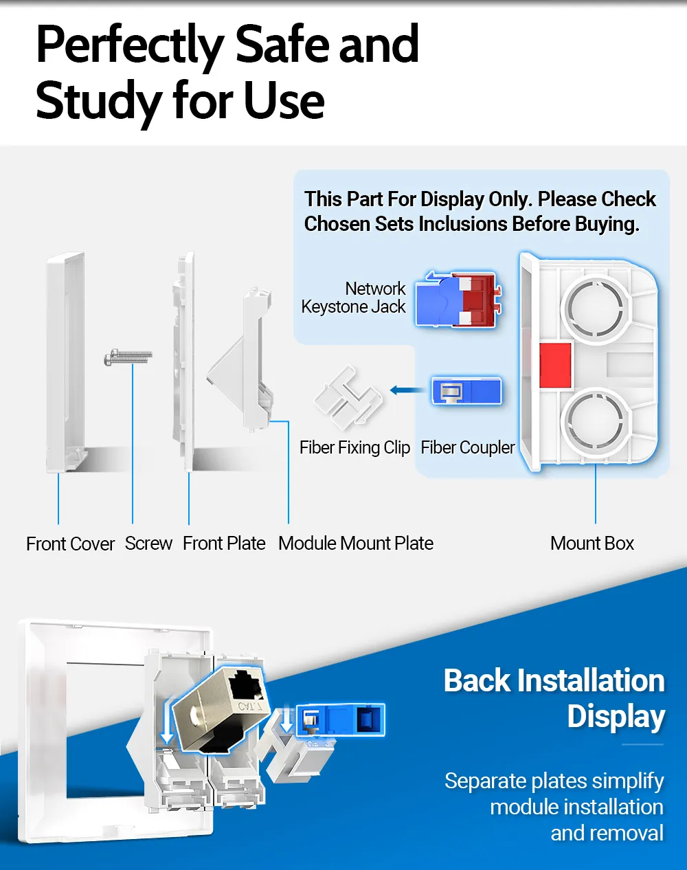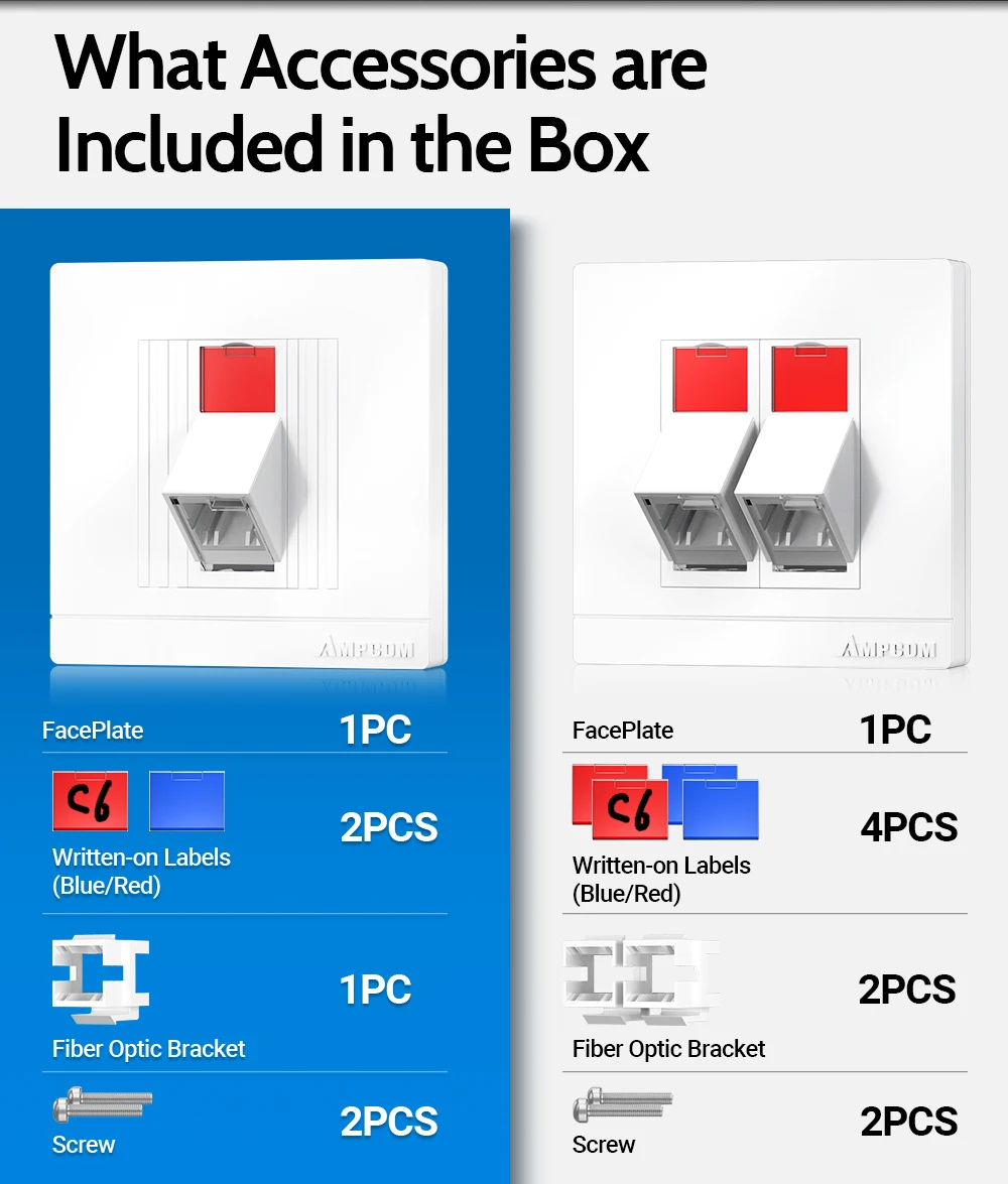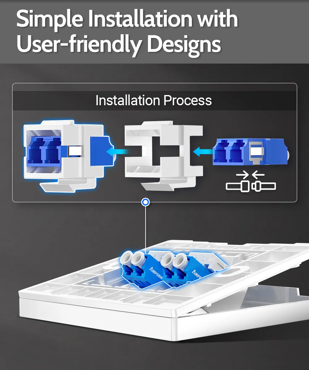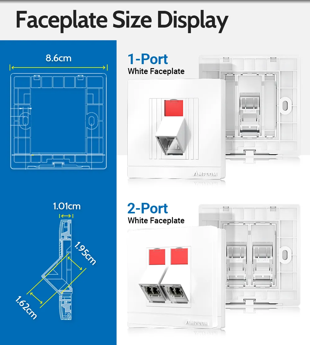 La placa frontal de 86*86 mm es compatible con módulos de teléfono y red de fibra óptica, RJ45 y RJ11, así como con módulos USB, coaxiales y otros (el producto incluye un soporte de acoplador de fibra óptica, pero no incluye el módulo ni el acoplador).