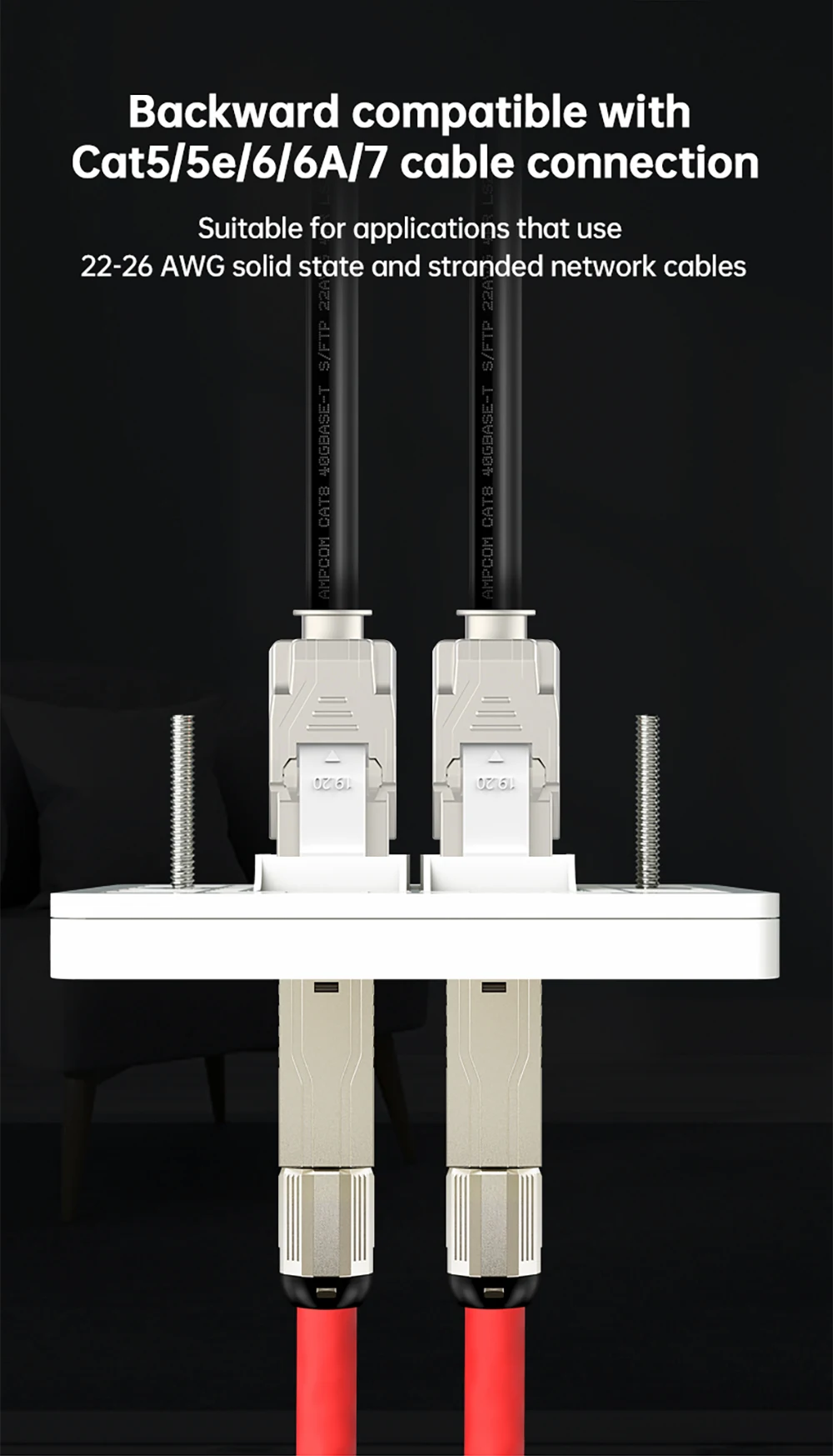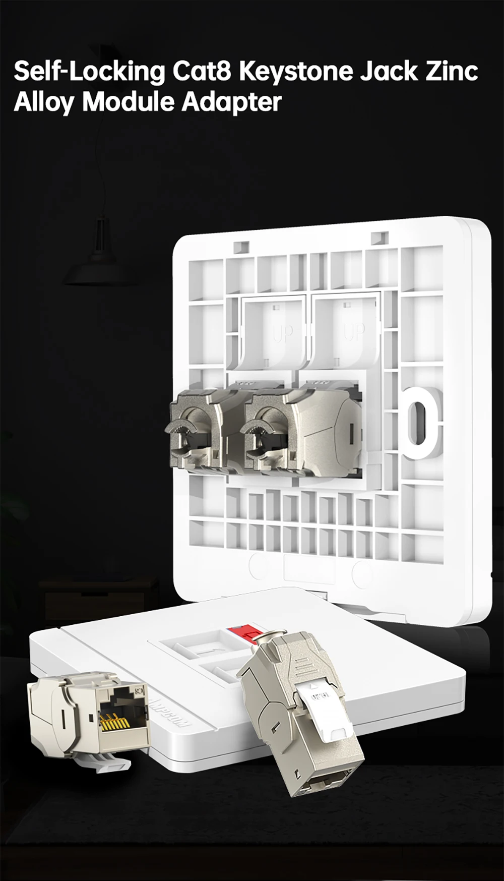 1.Esta chaqueta Keystone CAT 8 autoblocante completamente blindada no requiere herramientas. Está diseñada para un montaje fácil a presión para diferentes accesorios, como paneles de conexión Keystone, cajas de montaje en superficie o placas de pared (placas frontales).