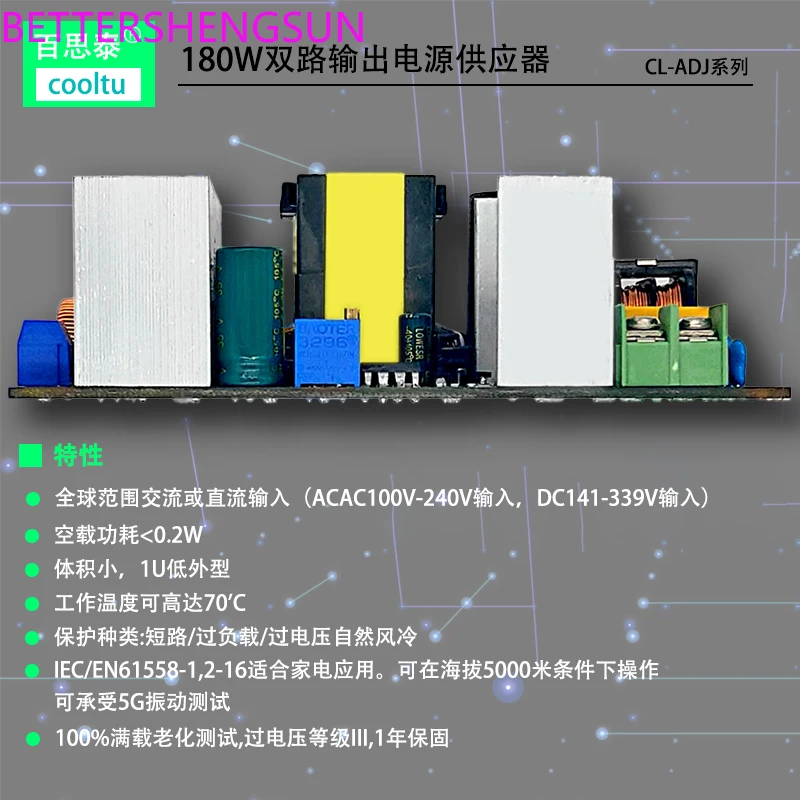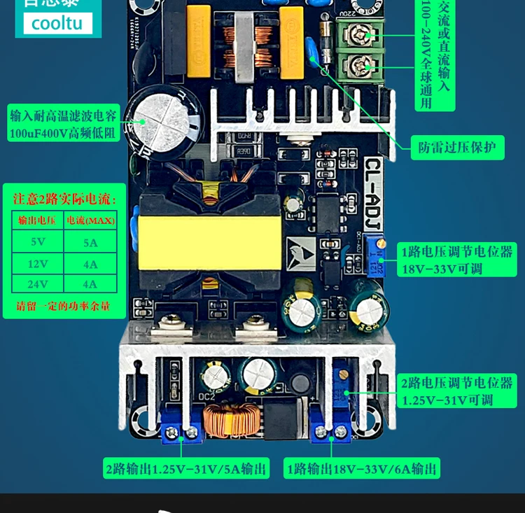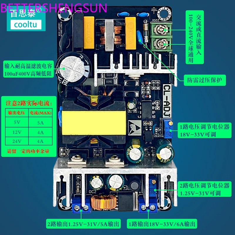 Placa de fuente de alimentación conmutada 24V12V5V, módulo de fuente de alimentación industrial de alta potencia, placa desnuda, salida dual, ajustable, 180W